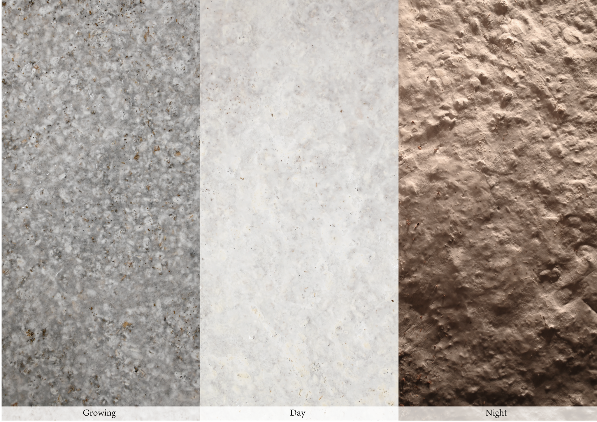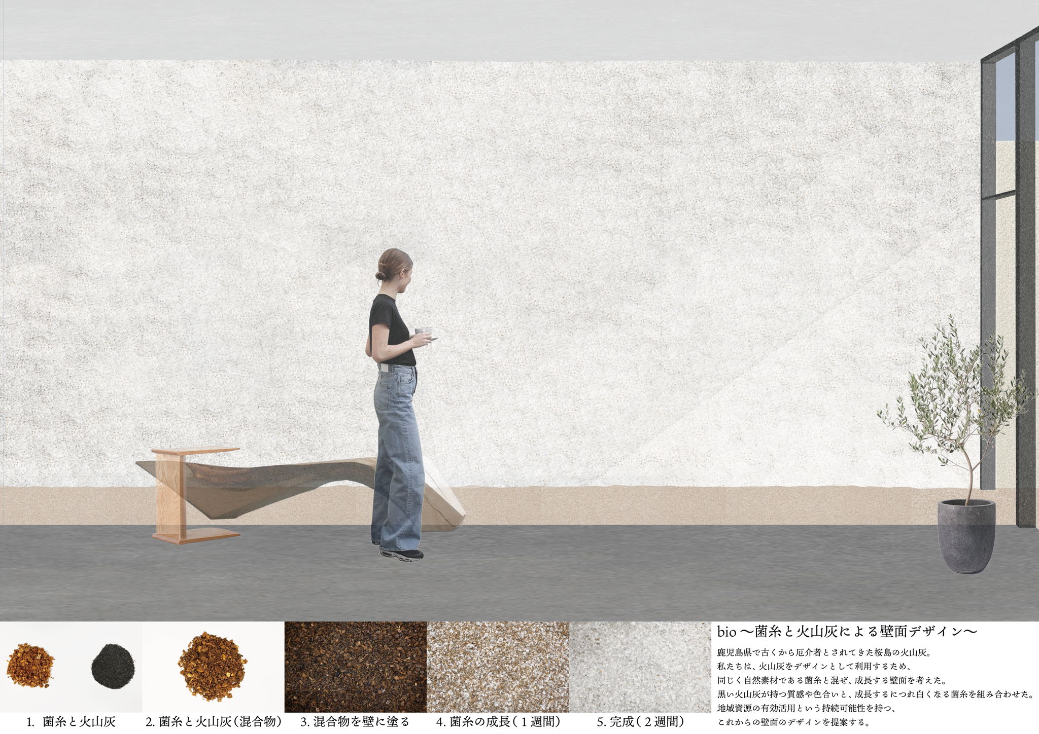 この壁面のデザインは菌糸と火山灰を混ぜ壁に塗ることで制作される。利用者の好みに合わせて菌糸と火山灰の割合を変え、壁面の色を調整することができる。明るい空間にしたい場合は菌糸を多く、暗めの空間にしたい場合は火山灰を多く混ぜることで空間に可変性を与えることができる。また、菌糸と火山灰から成る壁面は生分解性物質から構成されているため、不要になった際には砕いて土に還すことができる。