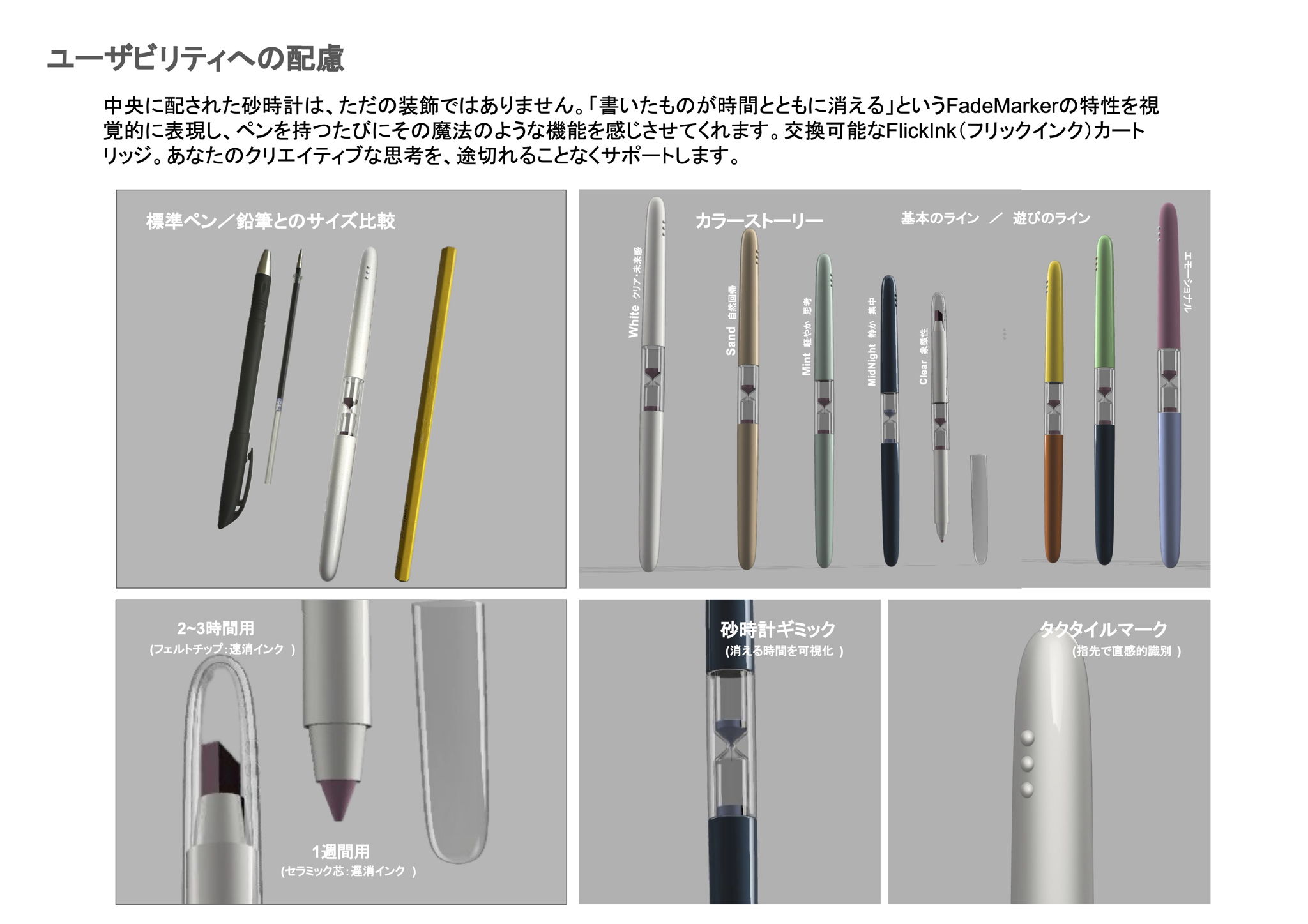 表現方法: 本体中央には、小型の砂時計ギミックを内蔵。砂の色はインクと同色。消える“時間性”を視覚的に表現する遊び心のあるディテールに。