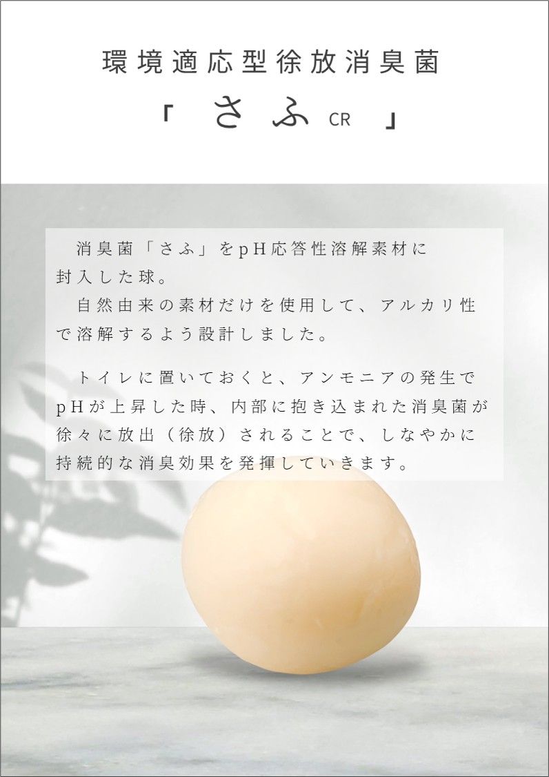 「さふCR」は周囲のpHに応答して徐々に溶出(徐放:Controled Release, CR)することで持続的な消臭を可能にした生分解性のボールです。