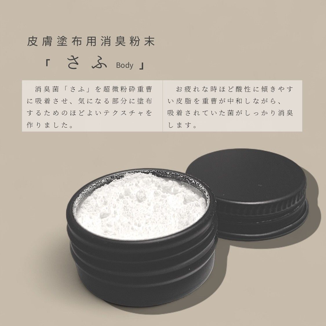 「さふ」に配合されたバクテリアたちは乾燥した重曹の中で仮死状態で休眠していますが、臭気源に接触して水分を吸うことで、たちまち菌たちの劇的な増殖が始まり、細菌種間で相互に機能を補い合いながら、臭気を高速に分解していく共利共生集団です。