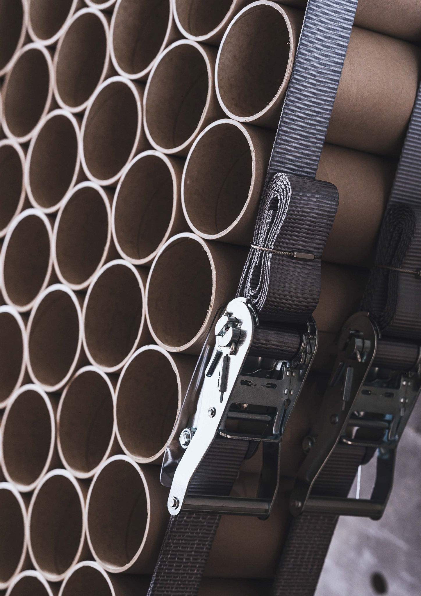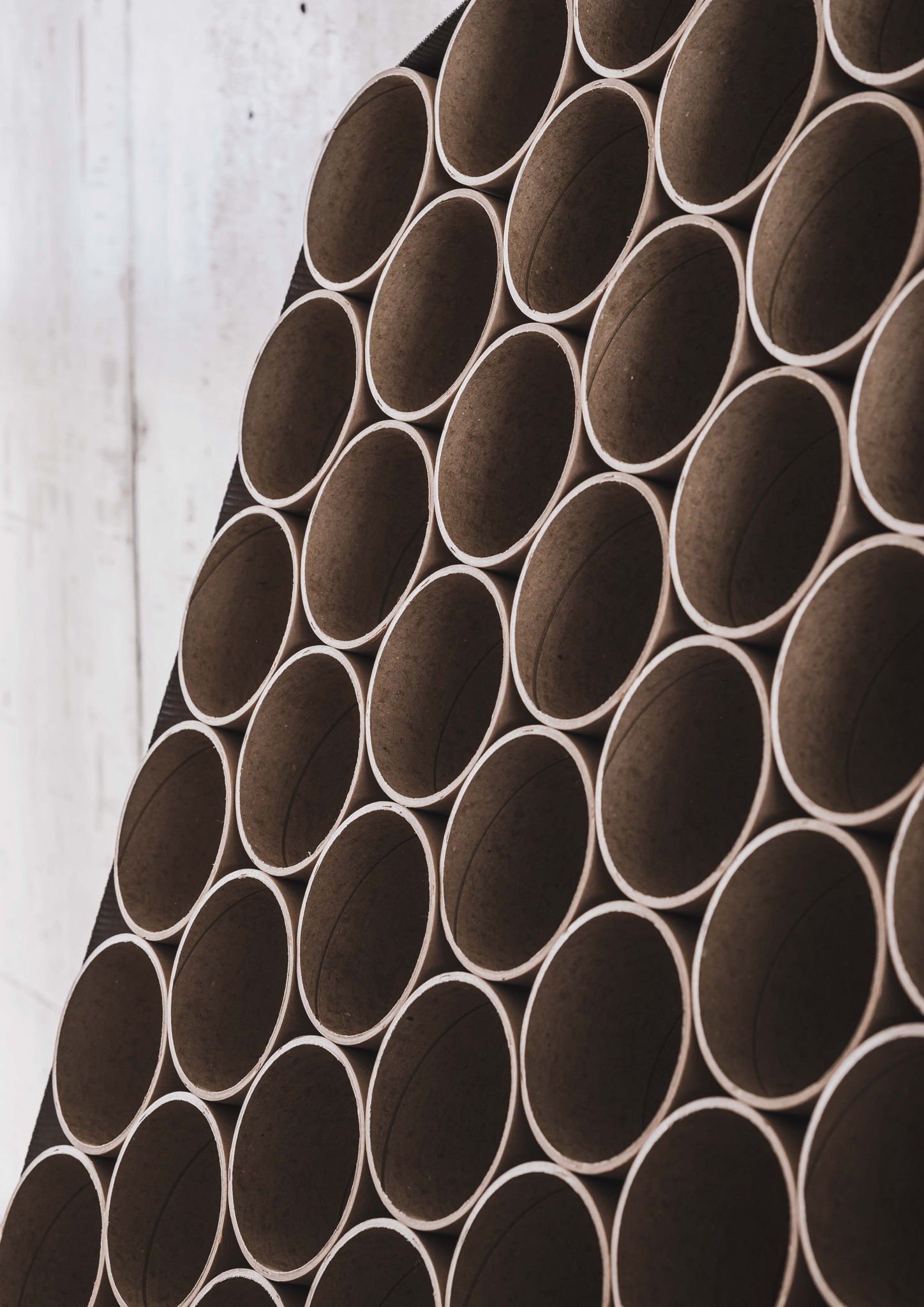 紙管を使用することで環境への配慮を行うと共に、ラッシングベルトのみで固定を行うことにより、ビスや接着剤を一切使用しないことで解体可能な構造としています。また、蜂の巣などに見られるハニカム構造となるように、紙管を互い違いに並べることで強度を高めながらベルトで固定するだけという柔軟性を持たせる形状としました。