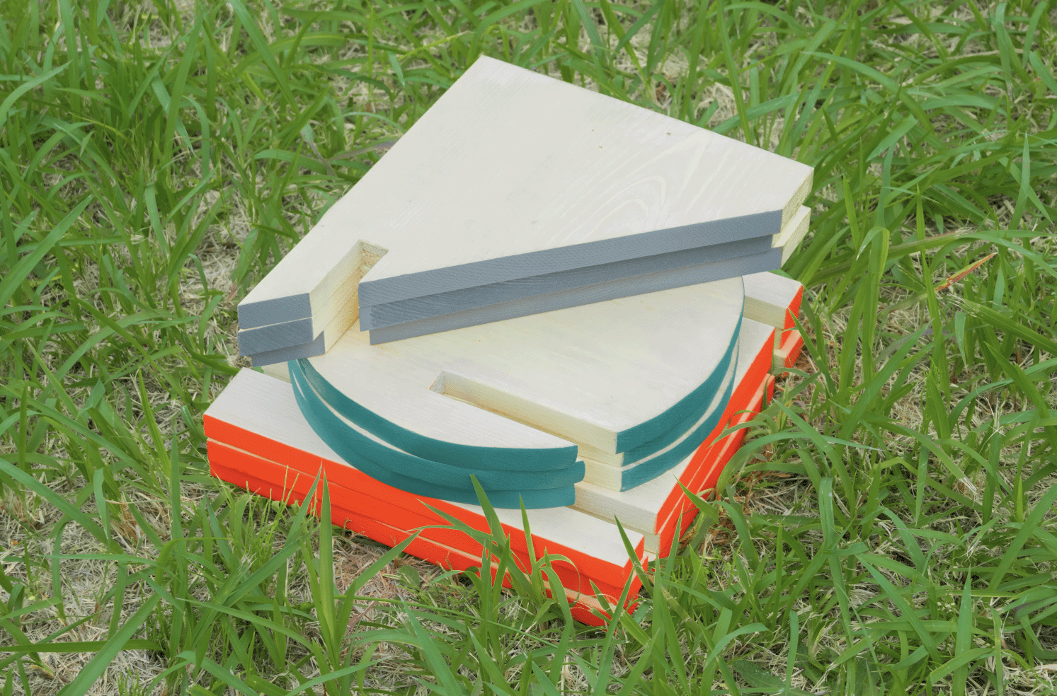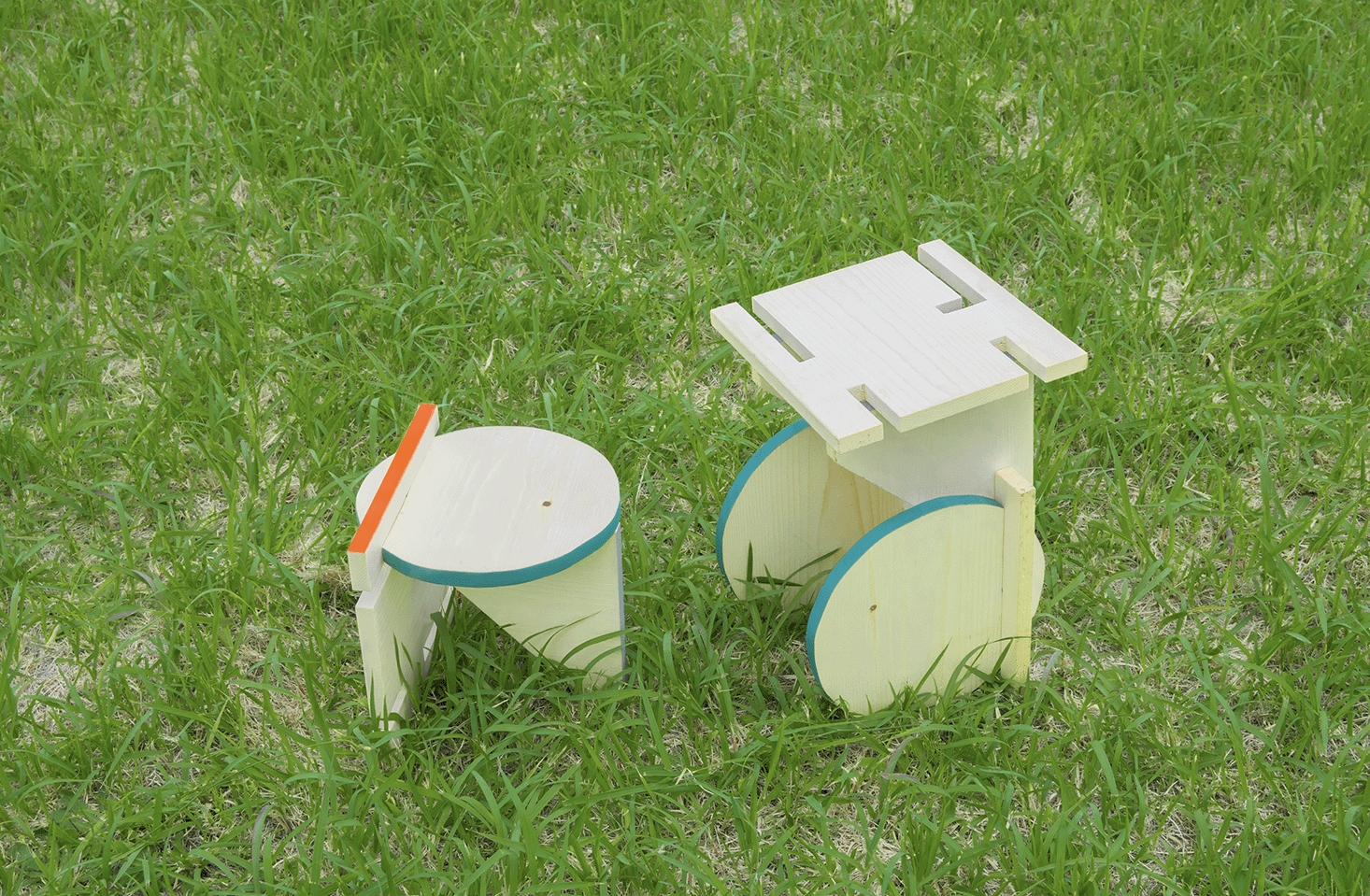 組み替えることで、見える面と見えない面が変化する。その性質を利用して、オレンジ、グレー、みどりの3色を塗装する面を制限することで、見える色数をコントロールしている。人数と共に色数も増えて、心も視覚も賑やかになっていく。 -