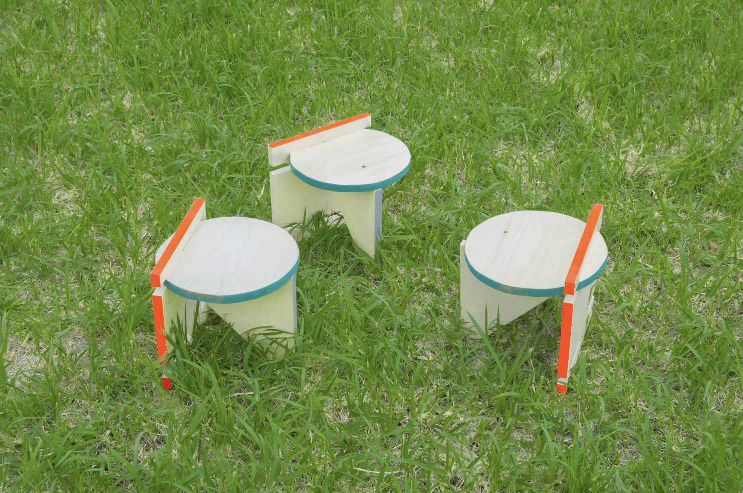 まる、さんかく、しかくの形をした板3 枚が一つのユニットとなり、ひとり分のスツールになる。そのユニットが3 つ、