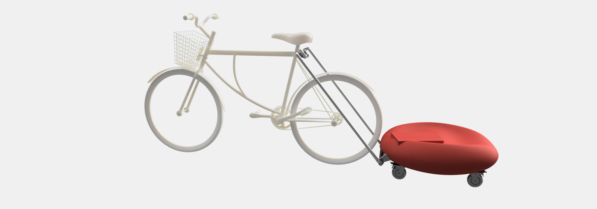 corocは、自転車とワンタッチで連結でき、日常生活の延長で“自分の手で荷物を運ぶ”ことができる新しい台車です。物流需要の増加に対し、配送を担う人手が減少しているいま、生活者自身がラストワンマイルを担うことで、ボトムアップからの解決を目指しています。柔らかなポリウレタン製の台車は、荷物を伸縮的に包み込みながら安定して固定し、自転車走行時も安心。使わないときは折りたたんでコンパクトに保管できます。赤血球をモチーフに、街に流れるやさしい物流の細胞のような存在を目指しました。