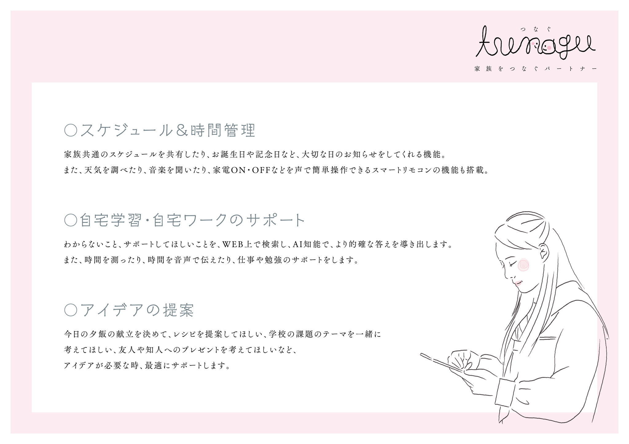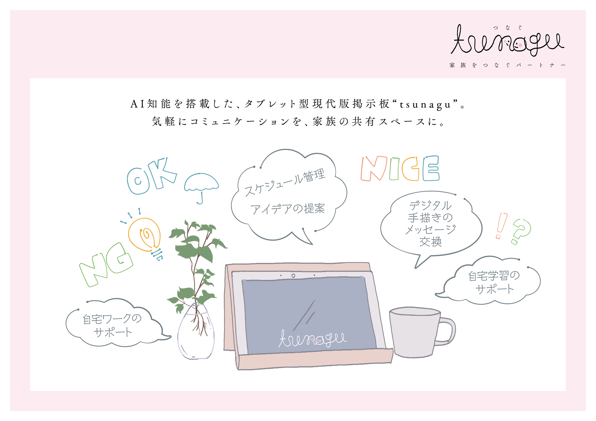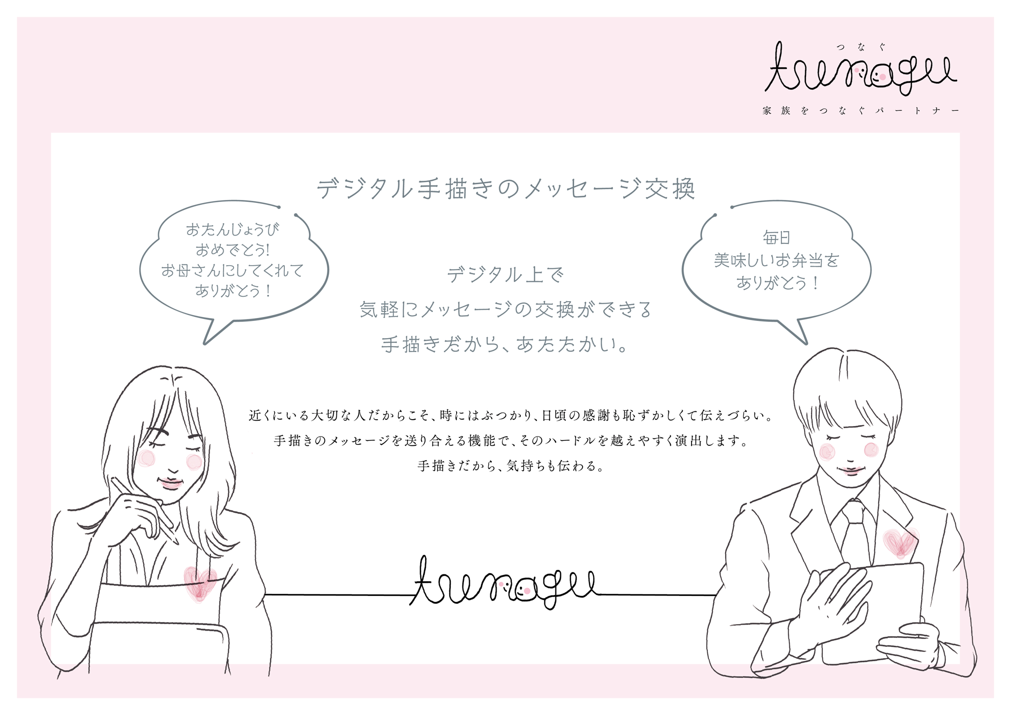 新しいパートナーを迎え入れるように、tsunagu(つなぐ)を迎え入れてもらえたら、と言う思いを込め、制作しました。