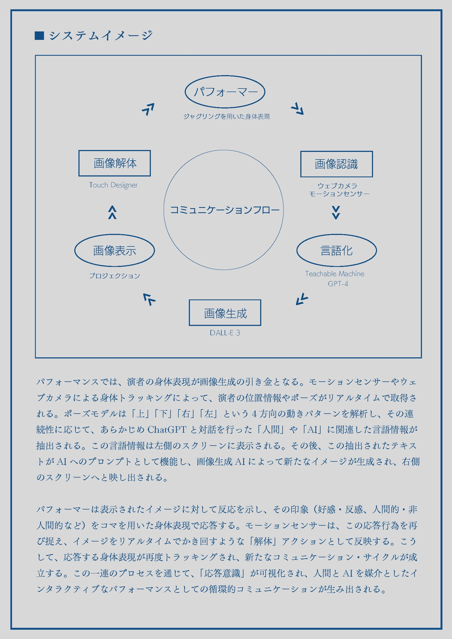 生成AIの台頭によって、容易に画像イメージの生成を行えるようになった。その生成時にはプロンプト(言語モデルへの指示)を並べて画像出力を行うが、時に不可解な返答も返ってくる。作者はそれを、互いに身を委ね合いながら一つのコミュニケーションを行う行為に重ね、自らの身体をぶつけながらイメージを用いたコミュニケーションを試みる。