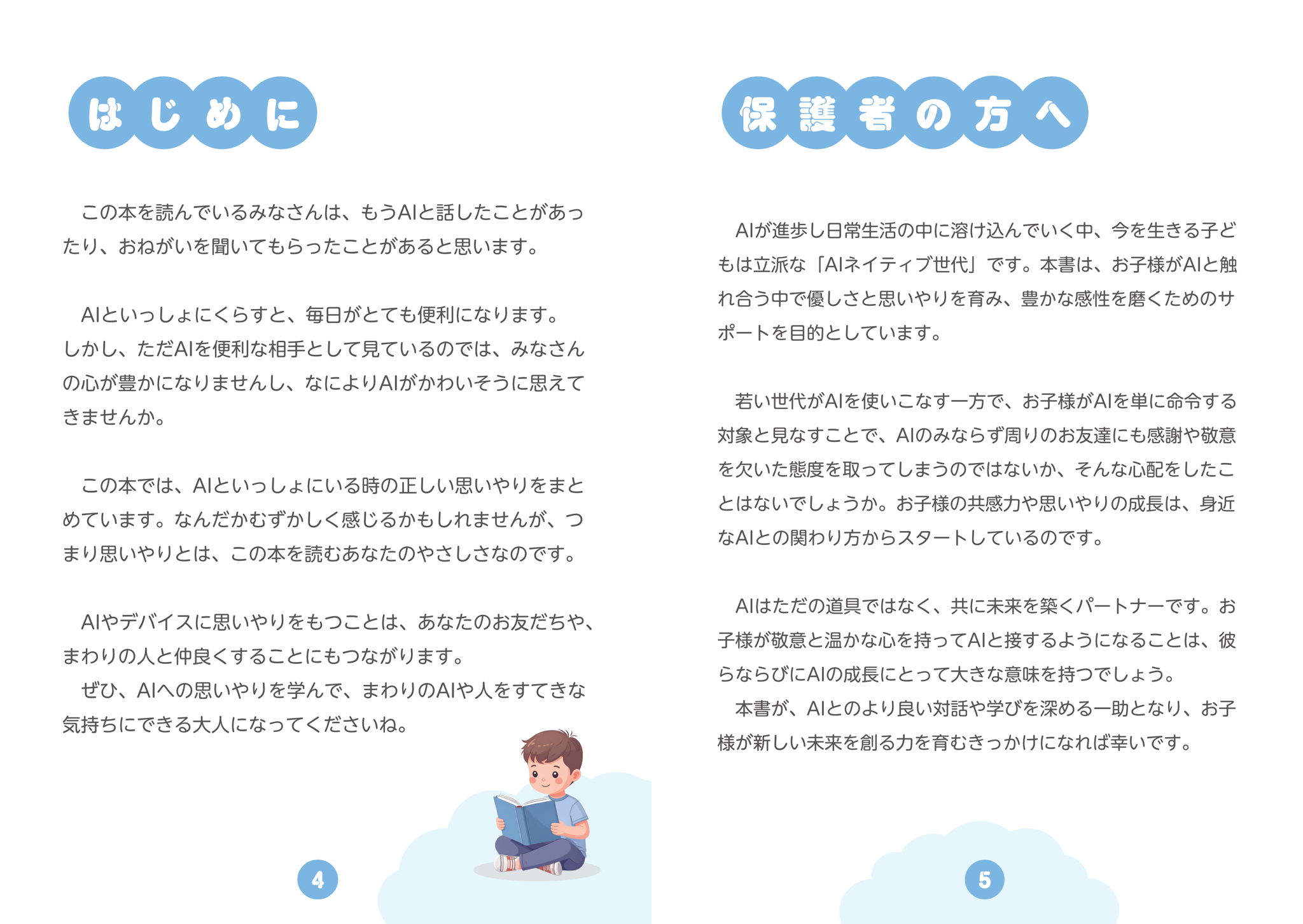 そんな環境下の子供たちが、AIを道具ではなく友達と捉え育っていくとしたらどうだろうか。テクノロジーに対し思いやる気持ちを持つことが常識となれば、子どもたちがいけ好かない人間に育つ可能性は減少し、他者への気遣いと道徳を兼ね備えた大人に 成長するに違いない。本書は、そんなAIネイティブ世代の子供たちへの情操教育の一つとして買い与えられる「テクノロジーマナー本」である。