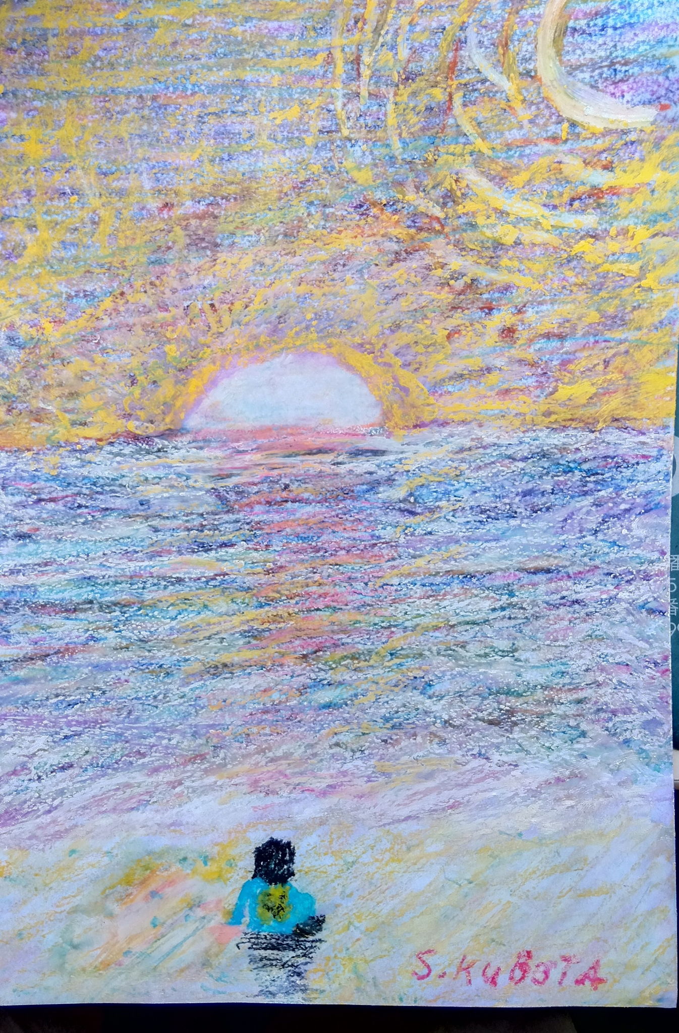 うみにしずむゆうひをみているひと。