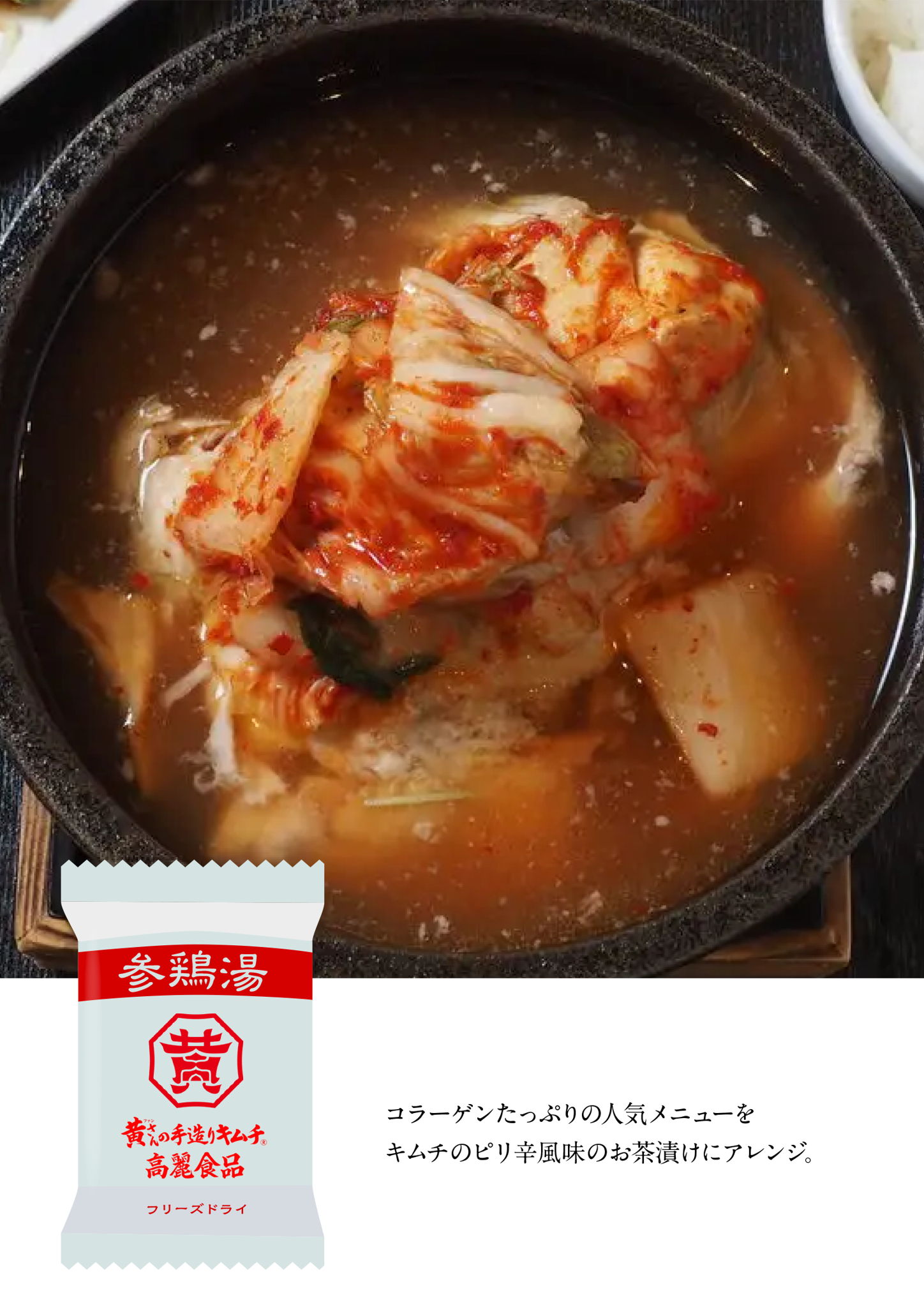 キムチをフリーズドライにしてお茶漬けとして展開。保存食としても機能し、お弁当や登山など携帯性も抜群です。フリーズドライのキムチは既に存在していますが、「お茶漬け」カテゴリーとすることで、飛びつきやすいキャッチーさがあります。フリーズドライのOEM委託は30kgからで、低コストでワンストップ製造が可能です。ヒット要因は、1.鮮烈な赤色、2.昆布・鶏・牛の3様の旨みの違いを明確に。韓国海苔や三ツ葉など、現実的な具材の選定に工夫を凝らすことだと考えています。販売価格は3種×2=計6点を1,500〜2,000円程度でネット販売できないかと思います。郵便ポスト発送で、梱包費用も送料も低価格で済みます。