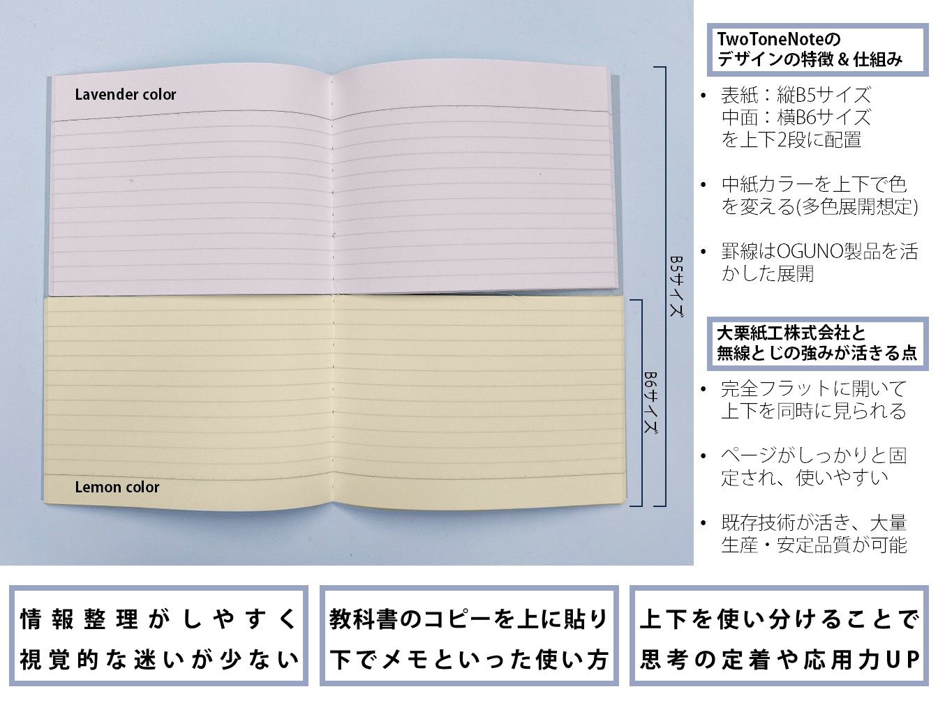 無線とじの特性である「フラットに開ける」強みと豊富なカラーバリエーションを活かした、新発想の学習用ノートです。表紙は縦B5、中紙は横B6サイズを上下2分割で配置し、ツートンカラーで並列に使える構造としました。上段に教科書コピーや資料を貼り、下段にメモや解説を書く、左右ではなく上下で比較・整理できるため、理解が深まり学習効率が向上します。語学や研究、創作活動にも応用可能で、情報を「見比べ・整理・展開」する新しい体験を提供します。大栗紙工の技術を最大限に生かした、ココロオドル新世代ノートです。