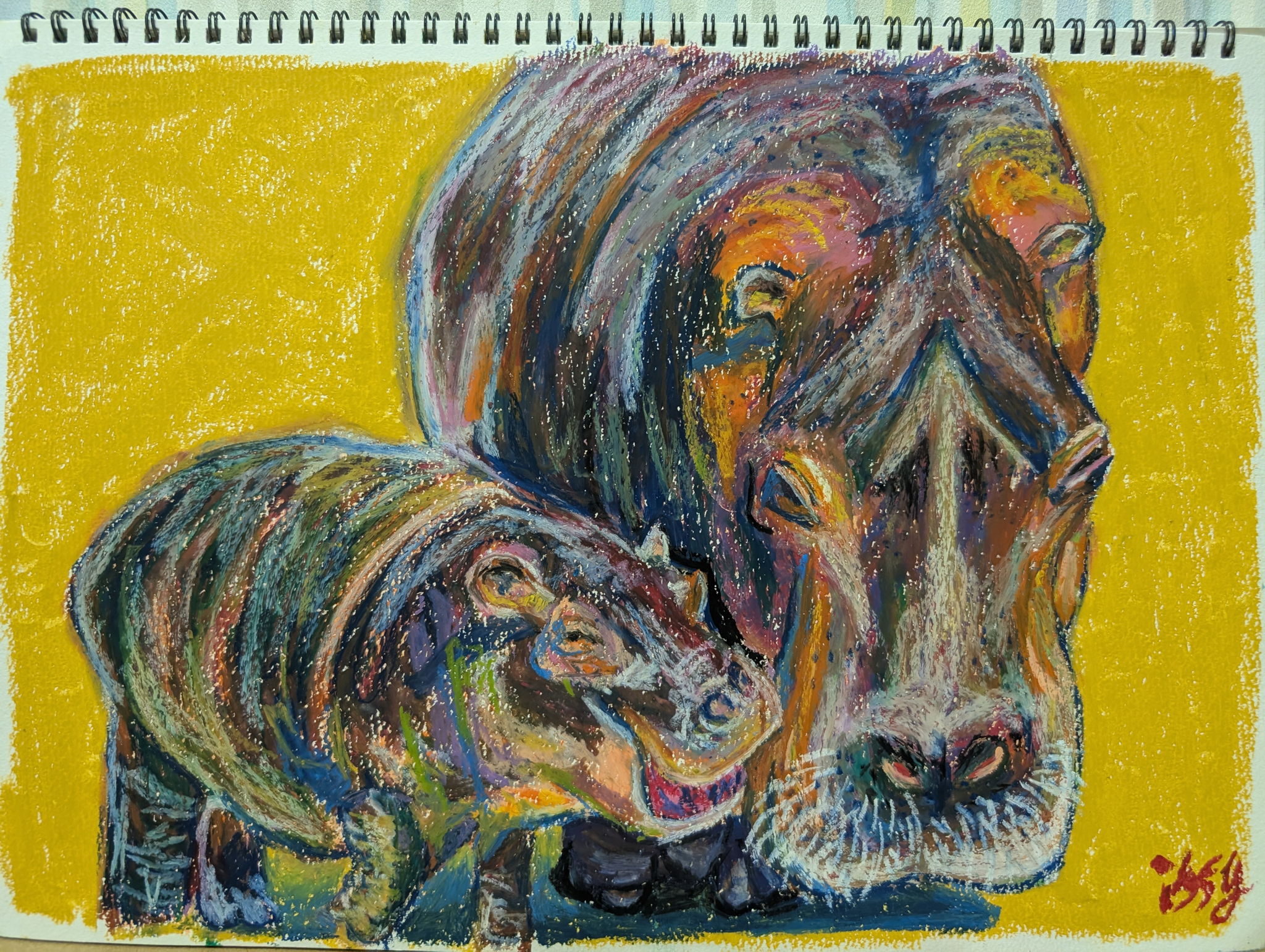 16色すべてを使い、カバの親子を描きました。母に寄り添う子どもと、温かく見守る母、心温まるワンシーンです。