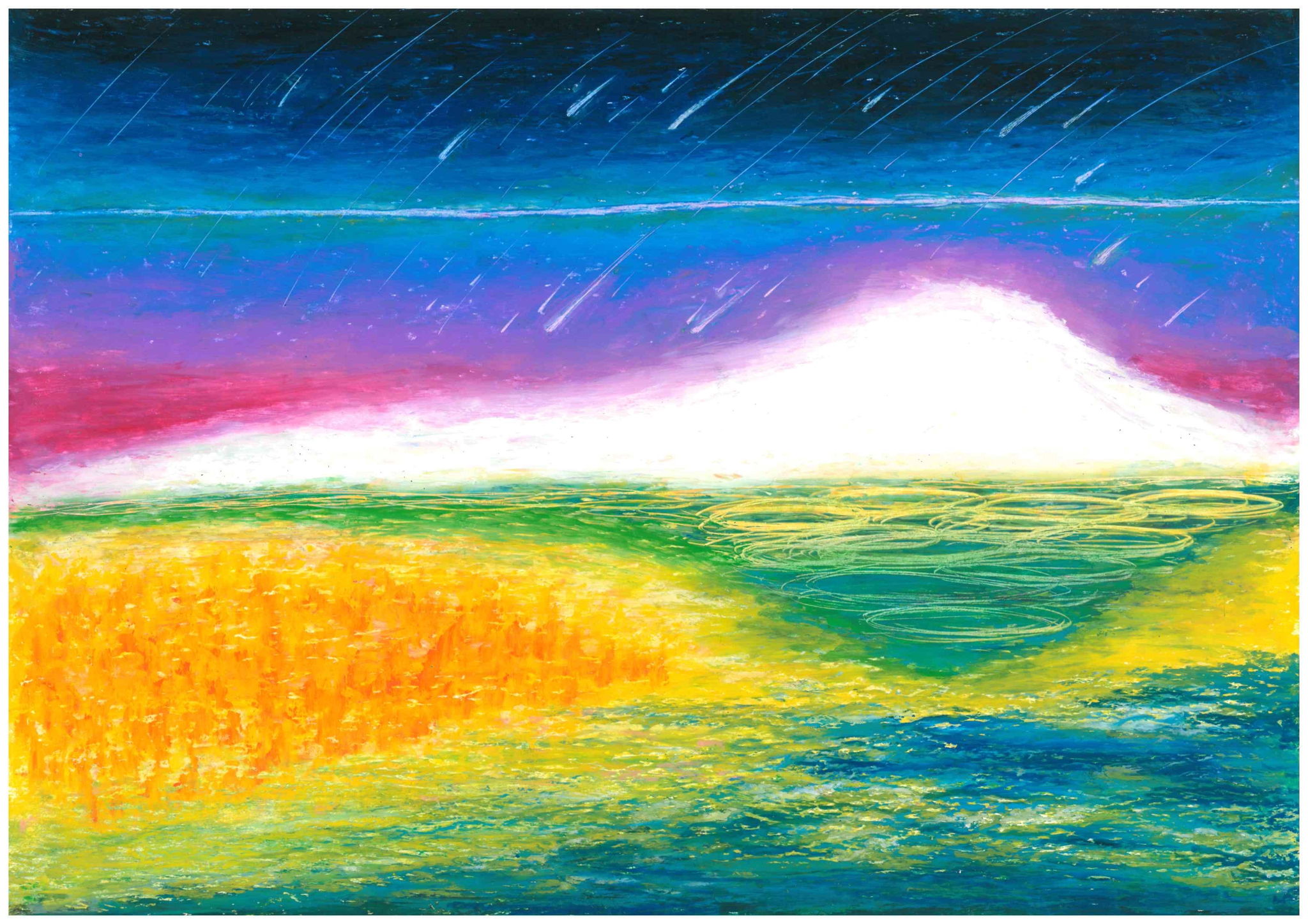 三島由紀夫の『金閣寺』が好きで、金閣寺が燃える様子を描きました。池から跳ねた鯉に、炎がうつります。池の赤みは火災の色でもありますが、戦争のイメージもあります。バックの青も炎です。夜空に浮かぶ月の曖昧な色合いは、放火した溝口の、他者から理解され難い思いを表しました。