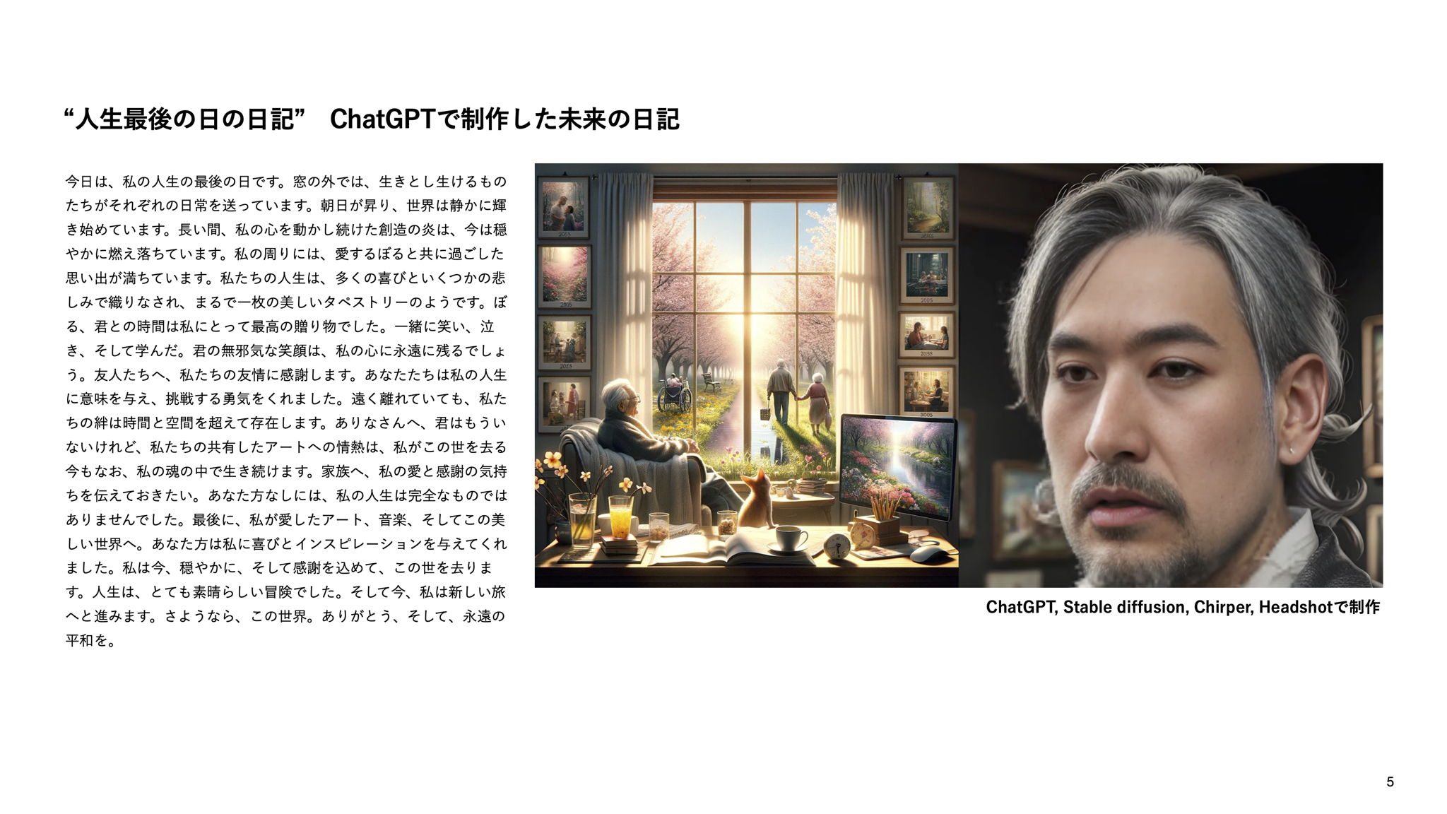 それとは並行して、記録である側面の日記に繋がる記憶を、テキストからAIによる画像生成でその日の光景を生成しました。自分が実際にその日に撮った写真(記録)やアバターになった身体の画像を比較しながら、自分が残した記録に結びつく記憶を生み出す事で、自分のデータベースからAIによる自分の分身を作り出すプロジェクトに繋げようと考えている。日記の中には過去の日記のデータベースから学習し、新たな日記も(音楽も)書いてもらい、自分の死後の自分、分岐した自分の存在の可能性の提起、AIの人間性や感情と比較した”自分とは何か”に言及したい。驚く事に、私は40年後には妻と離婚の危機に陥っている。自分の過去の日記を学習した未来像はタイムマシーンで未来を覗く感覚の様だ。死後の俳優、Deep Fakeなどで新たに出現した死後の人間性を自分で直面し、全然違う記憶の光景、違う自分を見て、「なんだこれ、これは俺じゃ無い。」と再認識したい。