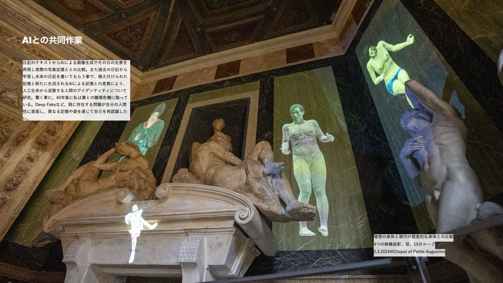 作者の半年分の記録した3Dの身体とモーションキャプチャーで作成されたアバターが日記のテキストを人工音声で独白。AIで作られた未来の私に変化していく。