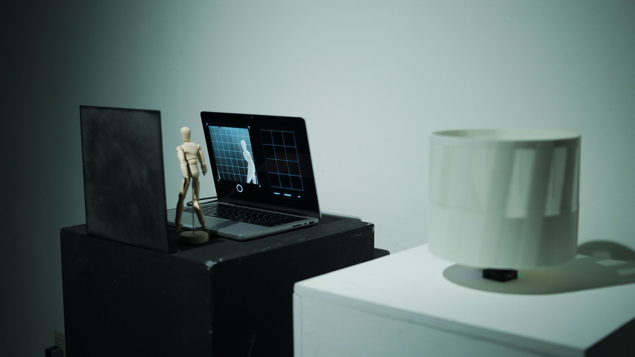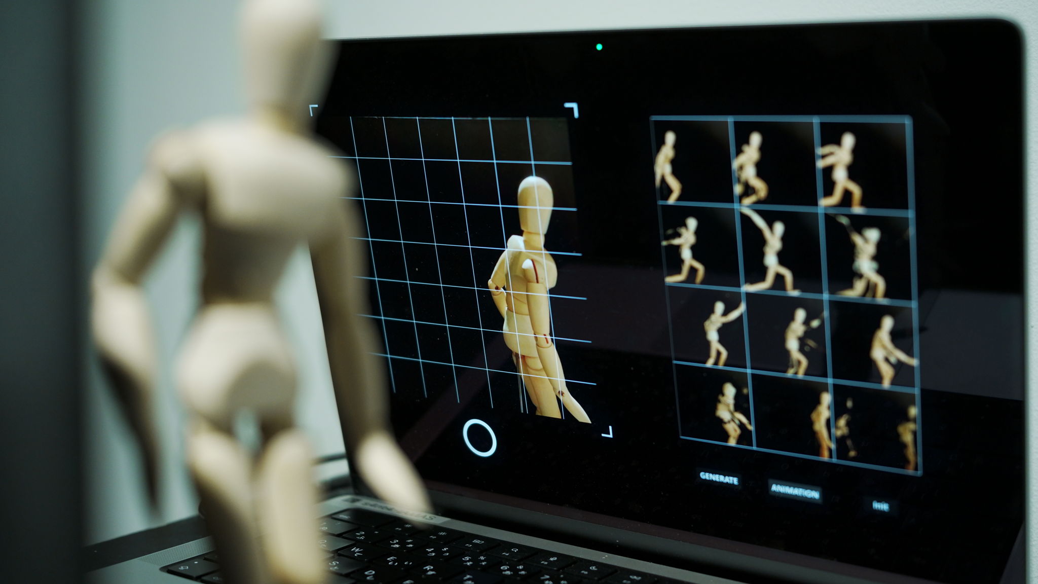 鑑賞者は、カメラの前に置かれたデッサン人形を用いて6コマの像を撮影する。AIは、撮影された6コマの像の間を1コマずつ補完する像を6枚生成する。そして、鑑賞者は撮影された6枚の像と生成により補完された6枚の像の合計12枚の像を並べた一連の動きをメディア装置であるゾートロープを通して観察する。