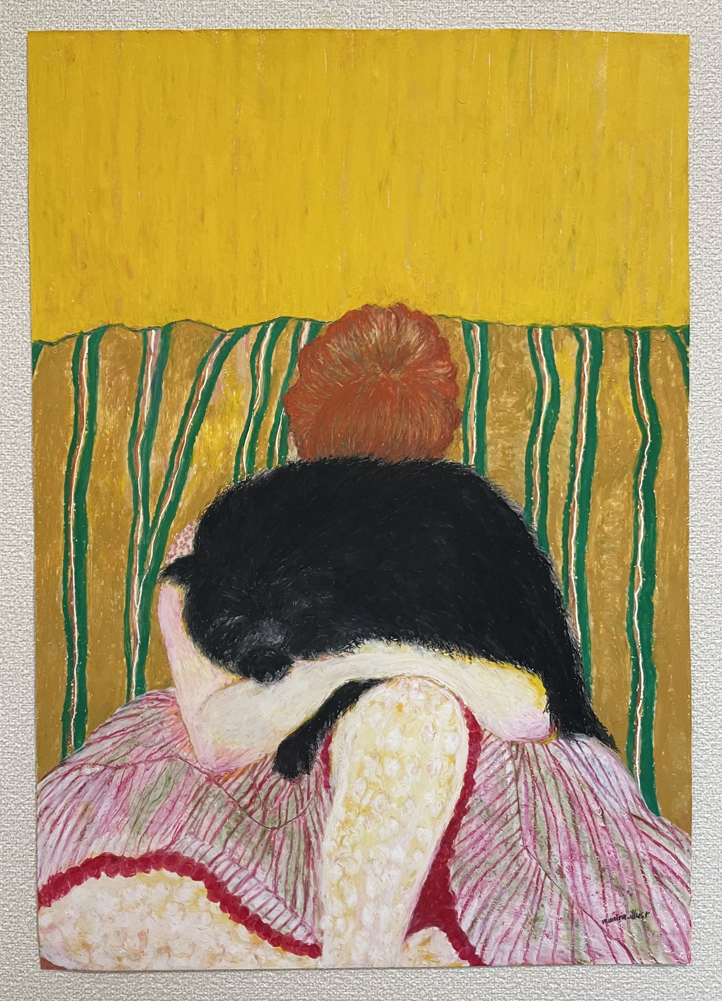 画用紙に色を乗せながら浮かんできた景色を描き進めると、ソファーで大きな黒猫を抱く姿になりました。物と物の境界線をどう描くかを悩みました。