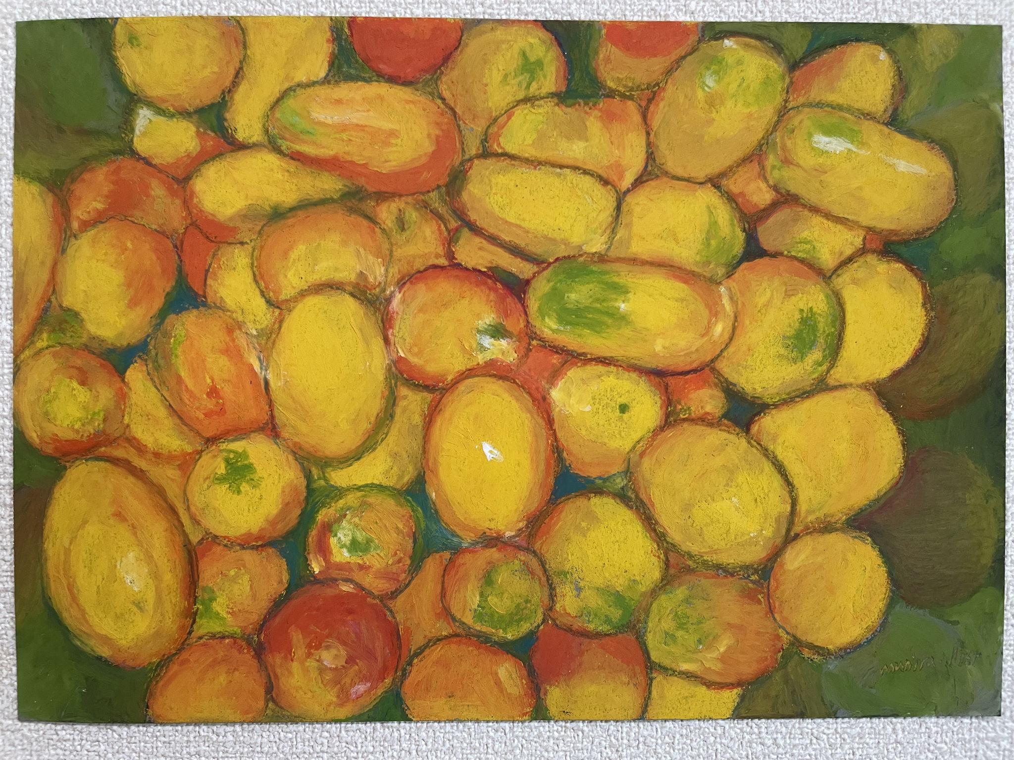 夏に庭で採れた大量の黄色いトマトを見て、色がとても綺麗だと思ったので描きました。