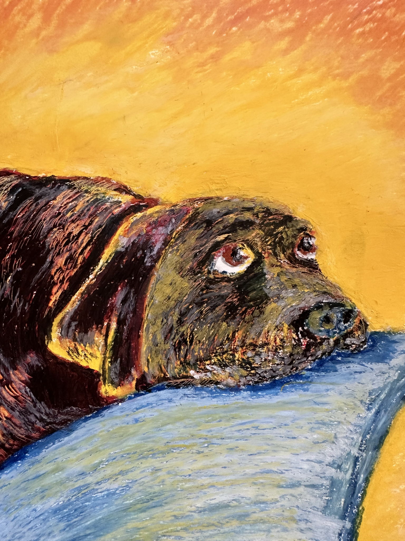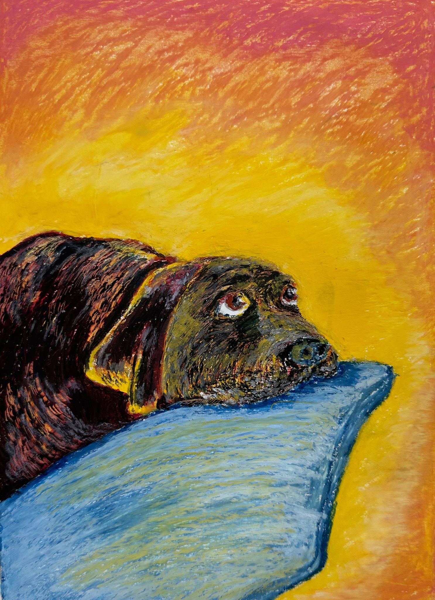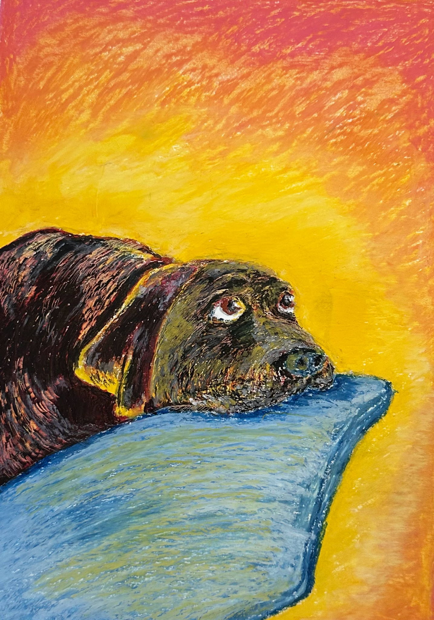 一昨年に虹の橋を渡ったわが家の愛され犬です。懐かしくこれまでの思い出を絵に描きました。散歩も終わって、オヤツも食べて、手持ち無沙汰のウダウダ時間。