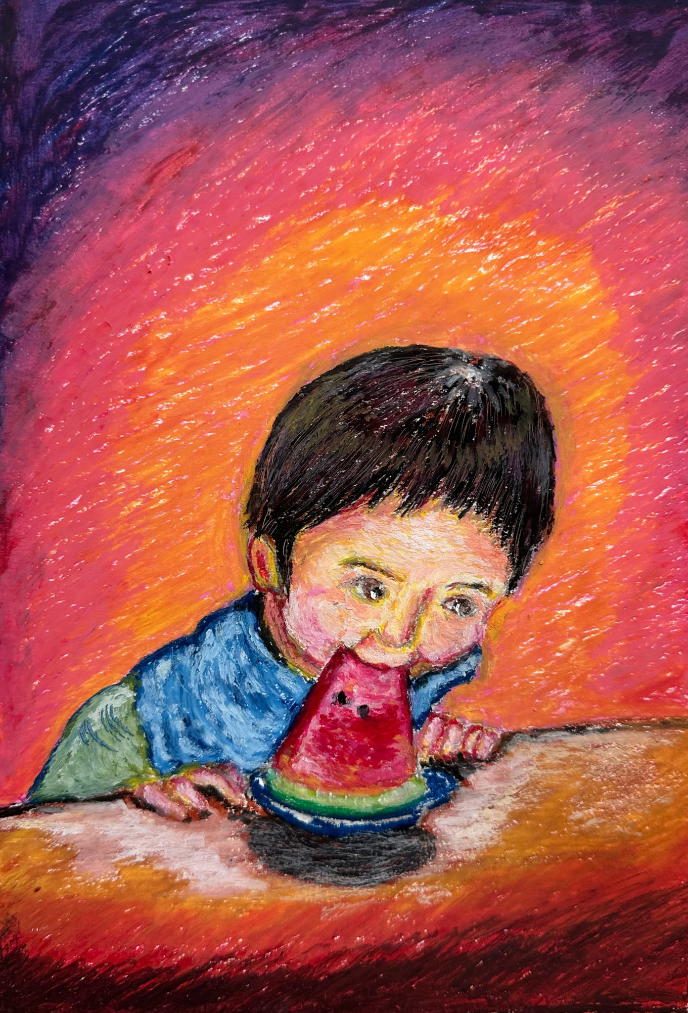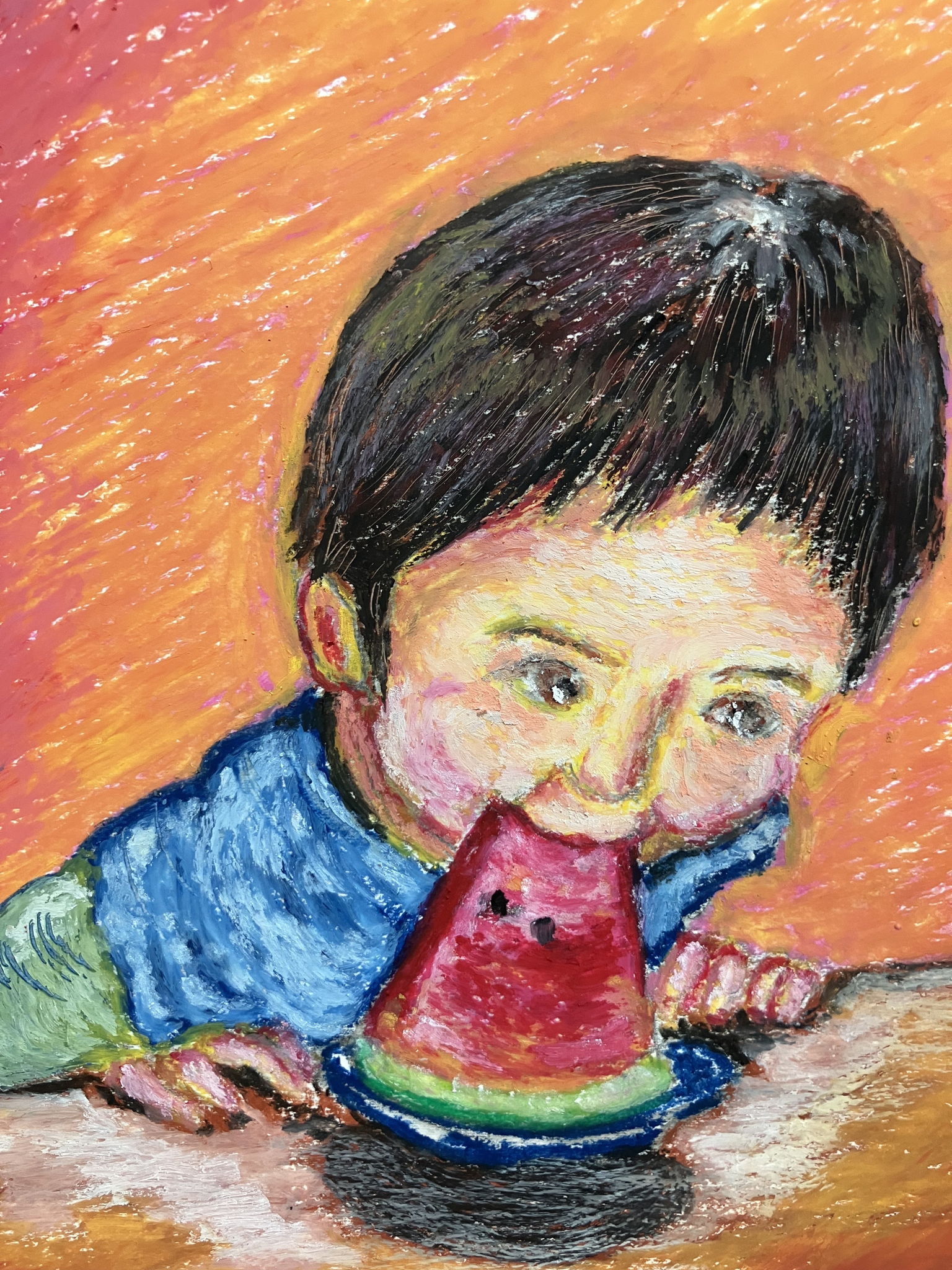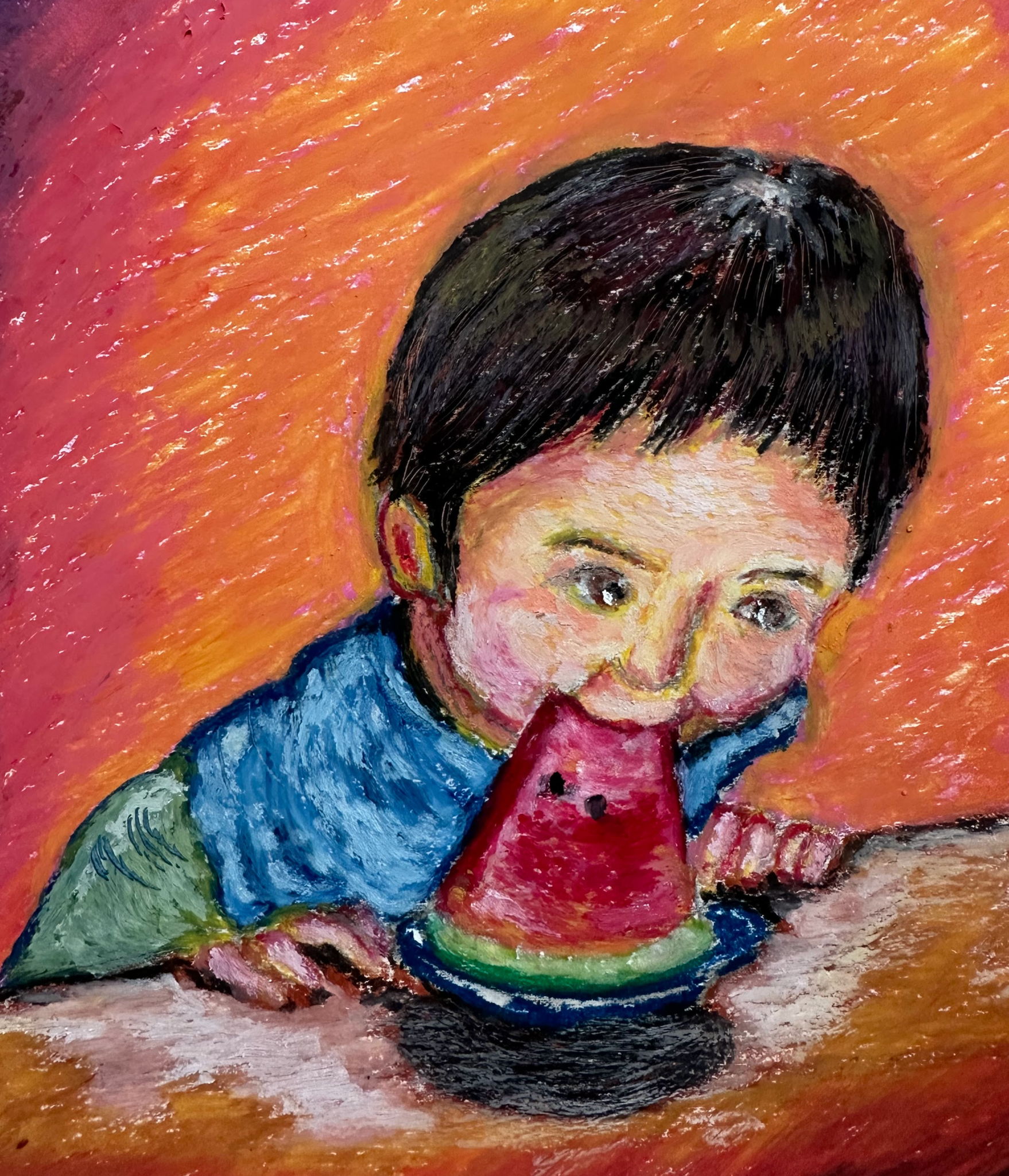 23年前の夏、大好物のスイカにかぶりつく3才の頃の次男。