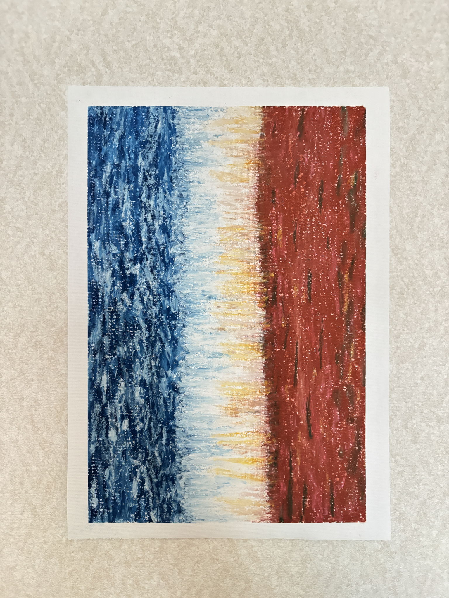 黄色や白の上から黒と青を重ねて、削り、海面に映る月明かりを表現しました