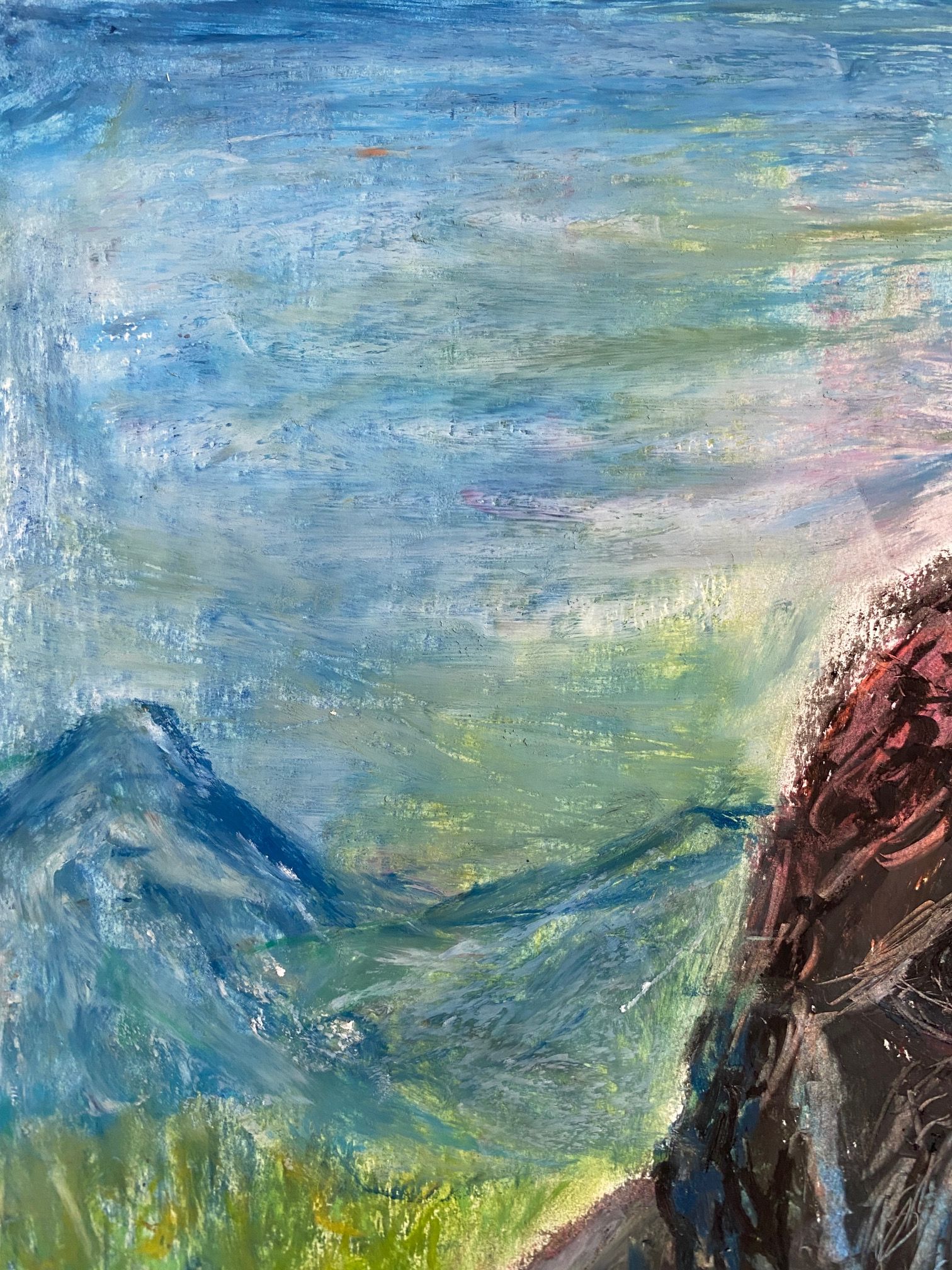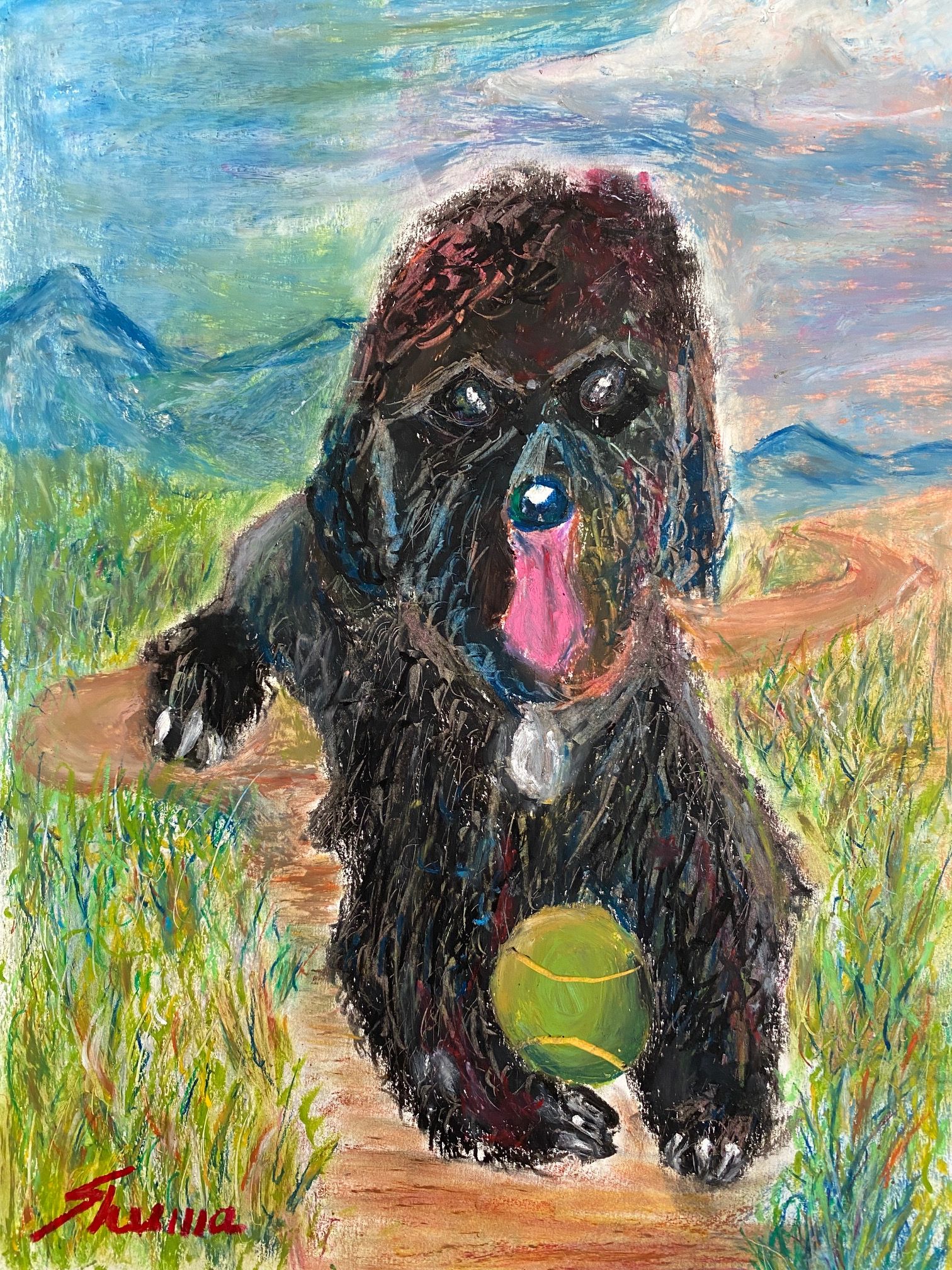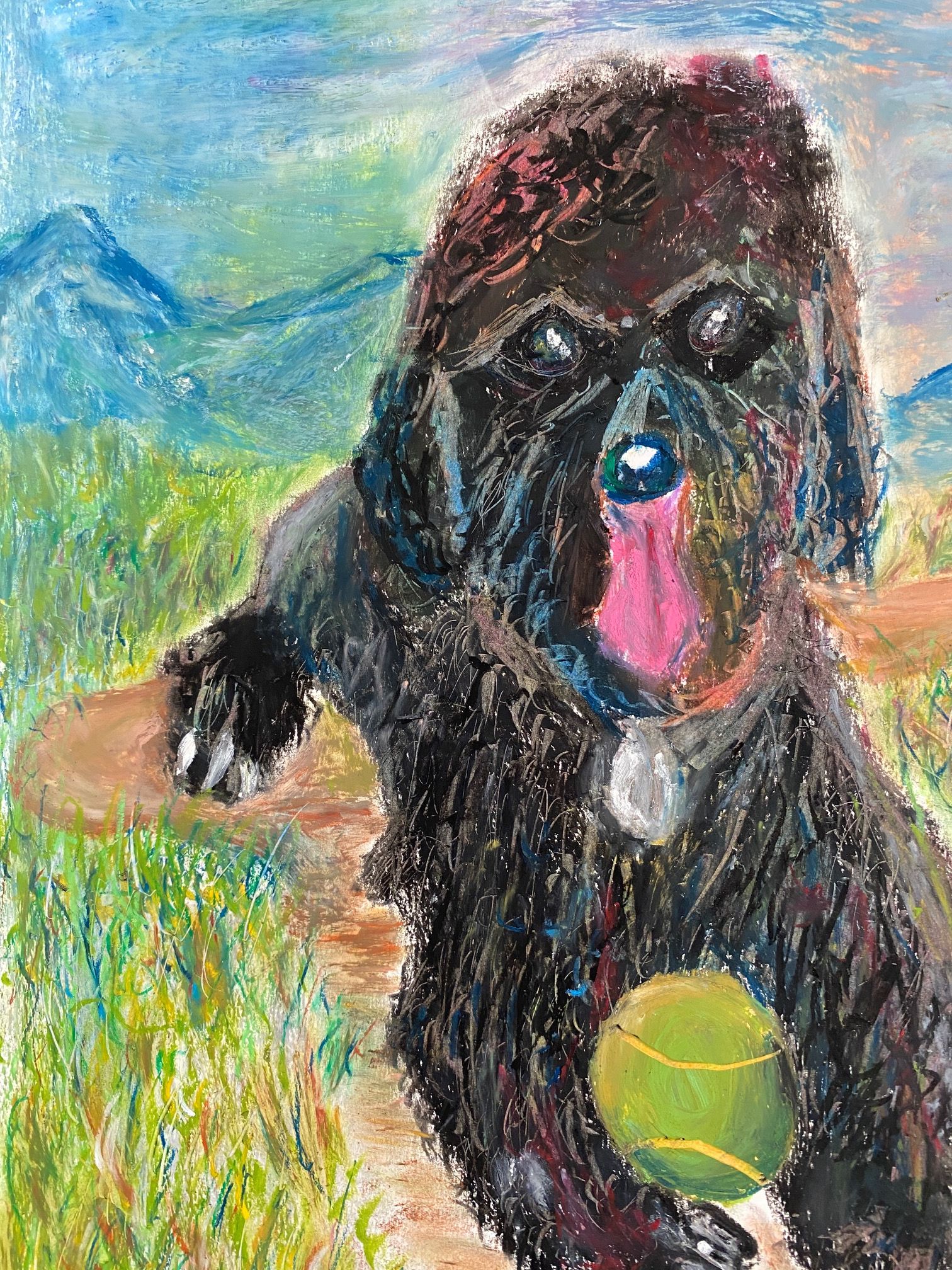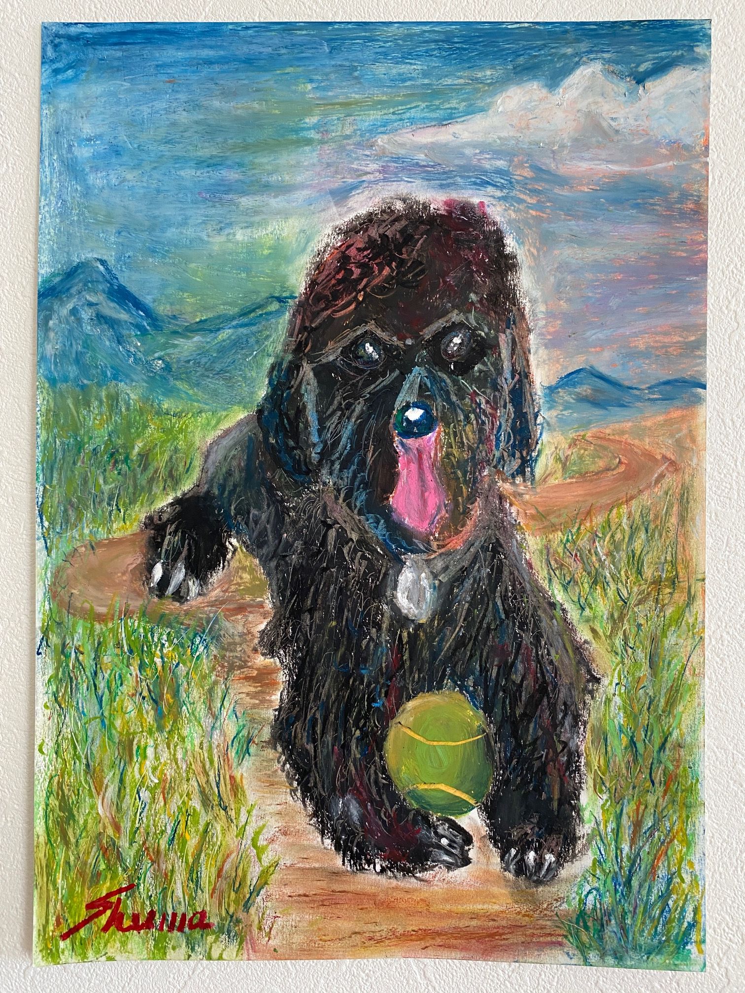 いきいきとした草と夢ちゃんのカールした毛を、クレヨンをひっかいて表しました。