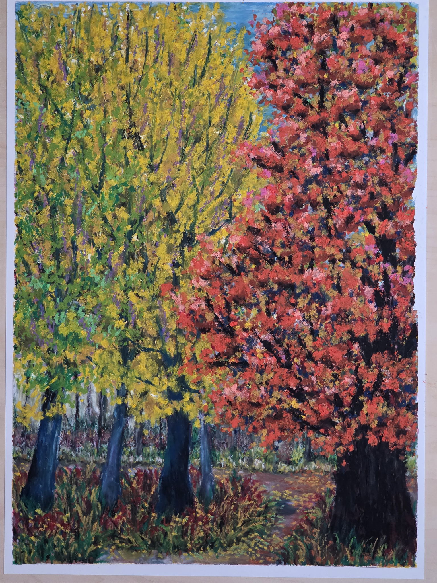 埼玉県にある農業試験場の木々は毎年見事に紅葉します。イチョウの黄色かもりもりと沸き立つようです見事にでした。その雰囲気がなかなか表現するのが難しいかったです。アートクレヨンの新色のバーミリオンやオレンジが綺麗で沢山使ってみました。