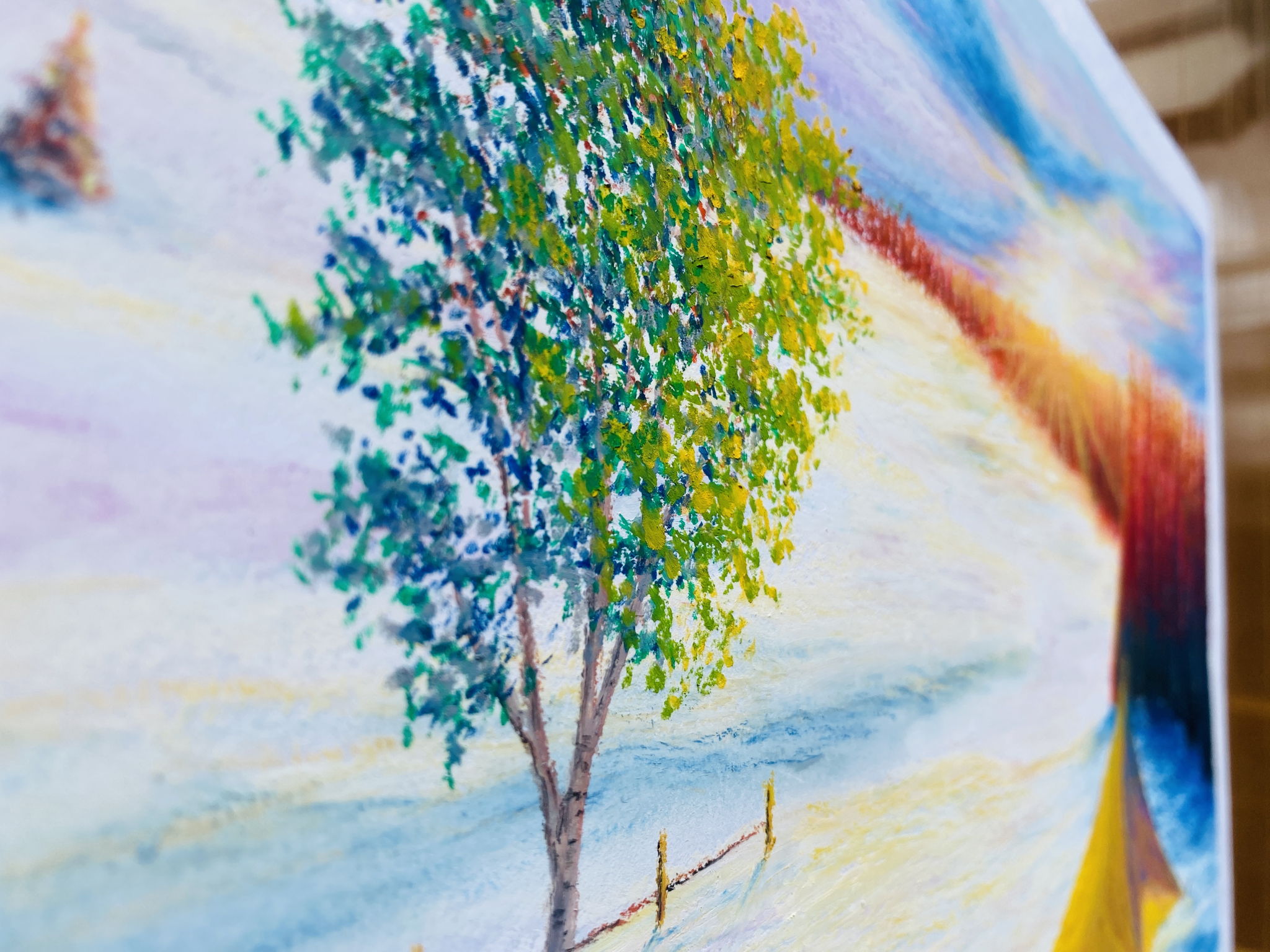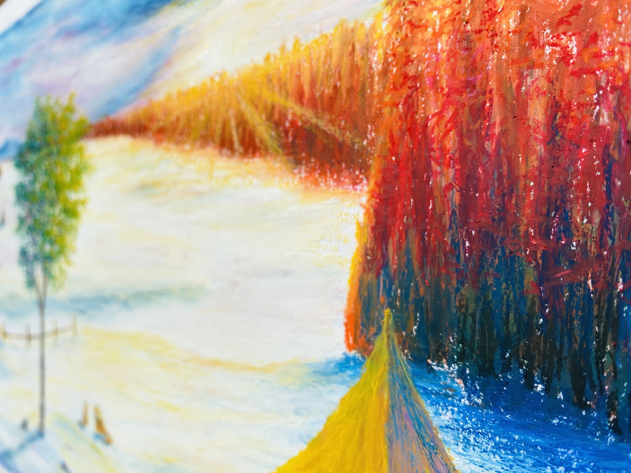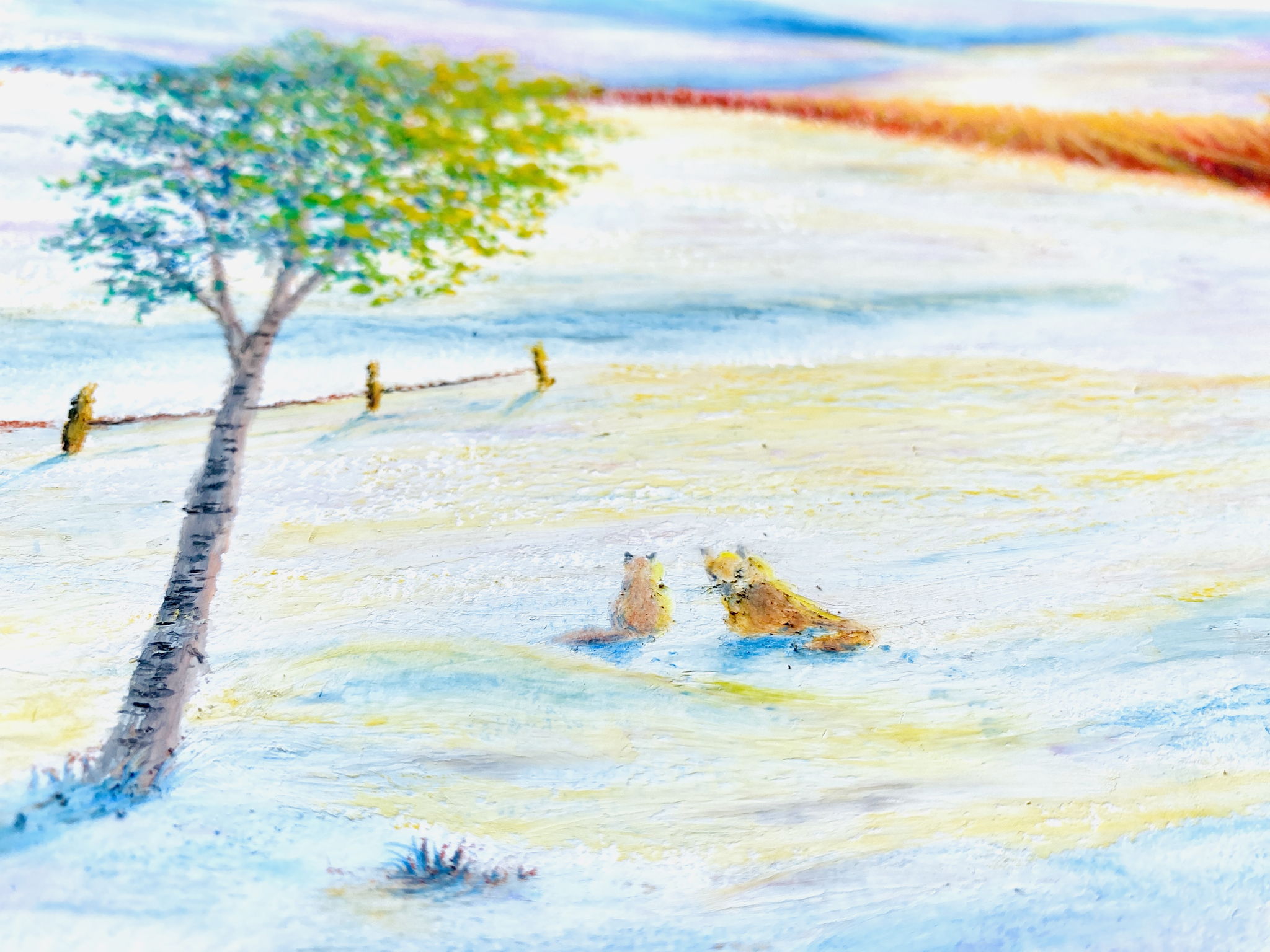 白樺の葉が芽生え、キタキツネのペアが朝日を拝む光景が見えるとき、季節の変わり目、自然の神秘を感じます。まだ行った事がない北国の風景を描いてみたいと思い、自分なりにイメージして描きました。北国の広い大地に冷たさや、どことなく寂しさを感じますが、太陽の光や、植物、動物の訪れで賑やかさが増してくる。そんな春が訪れそうなまだ冷たい雪原を、朝焼けの光が暖かく包み込む様子を寒色と暖色を混ぜて表現(色遊び)しました。