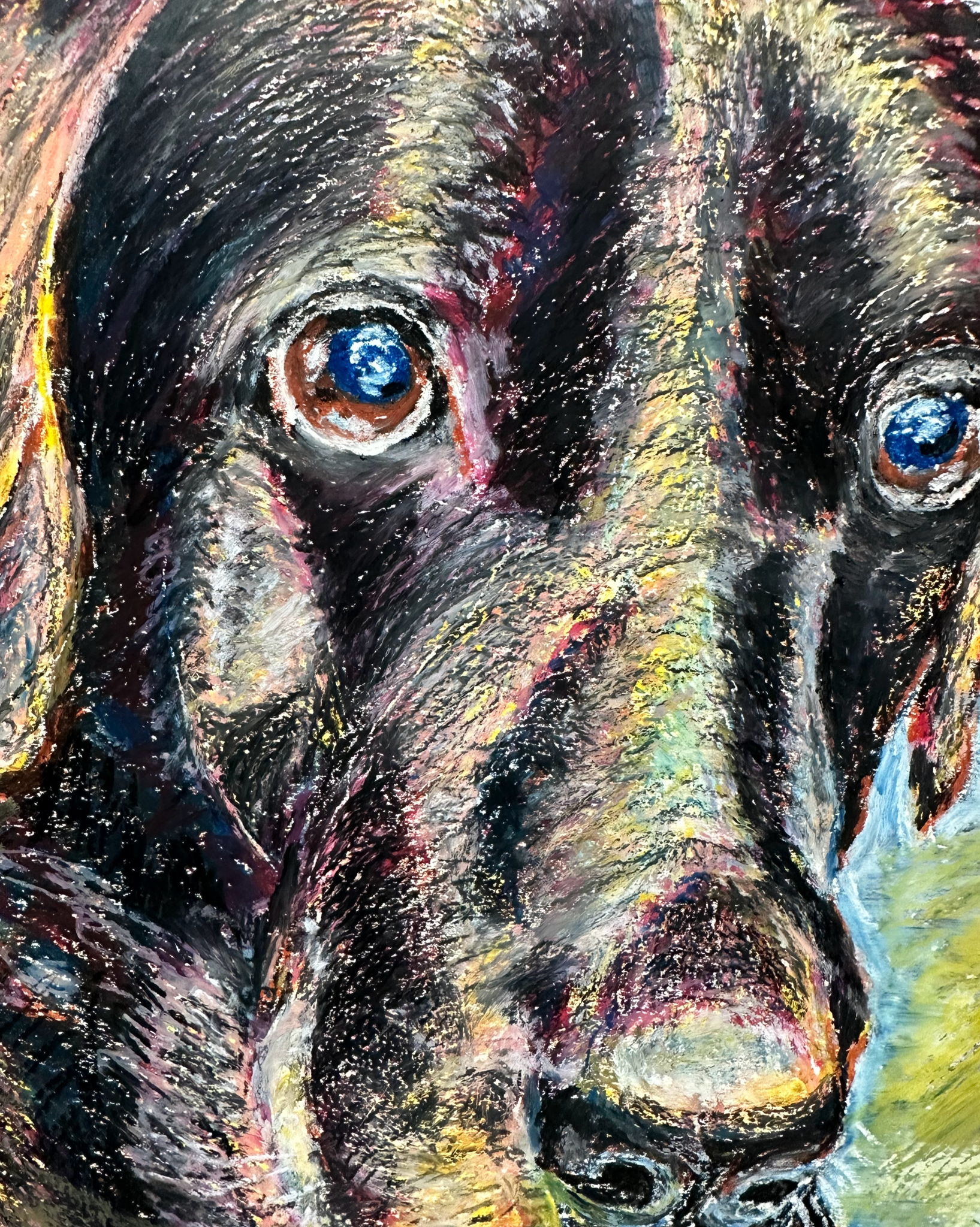 一昨年に虹の橋を渡ったわが家の愛され犬です。アートクレヨンの特徴を活かして、家族を見つめるいつもの優しい眼差しと、ツヤツヤの毛並みを描きました。
