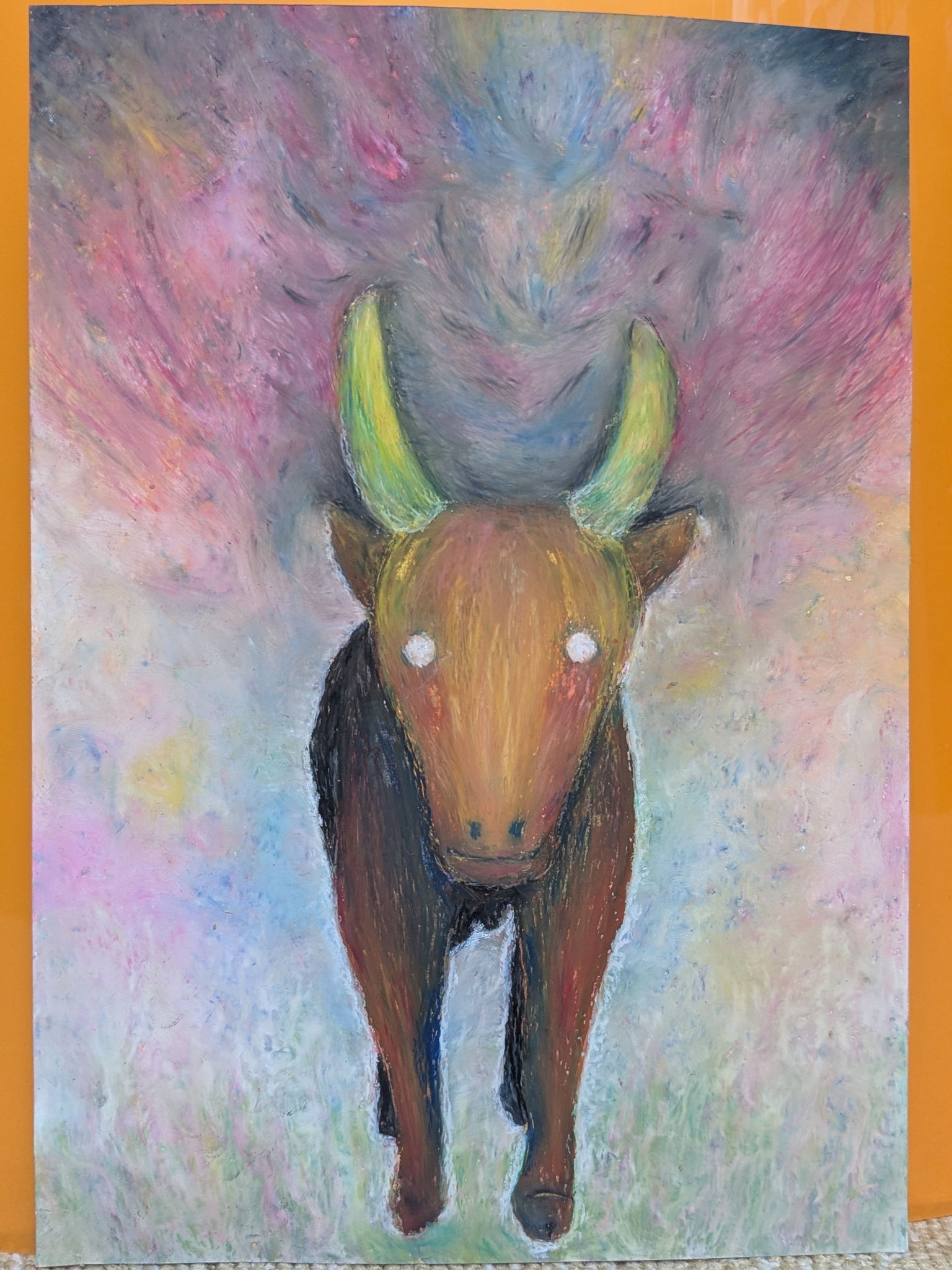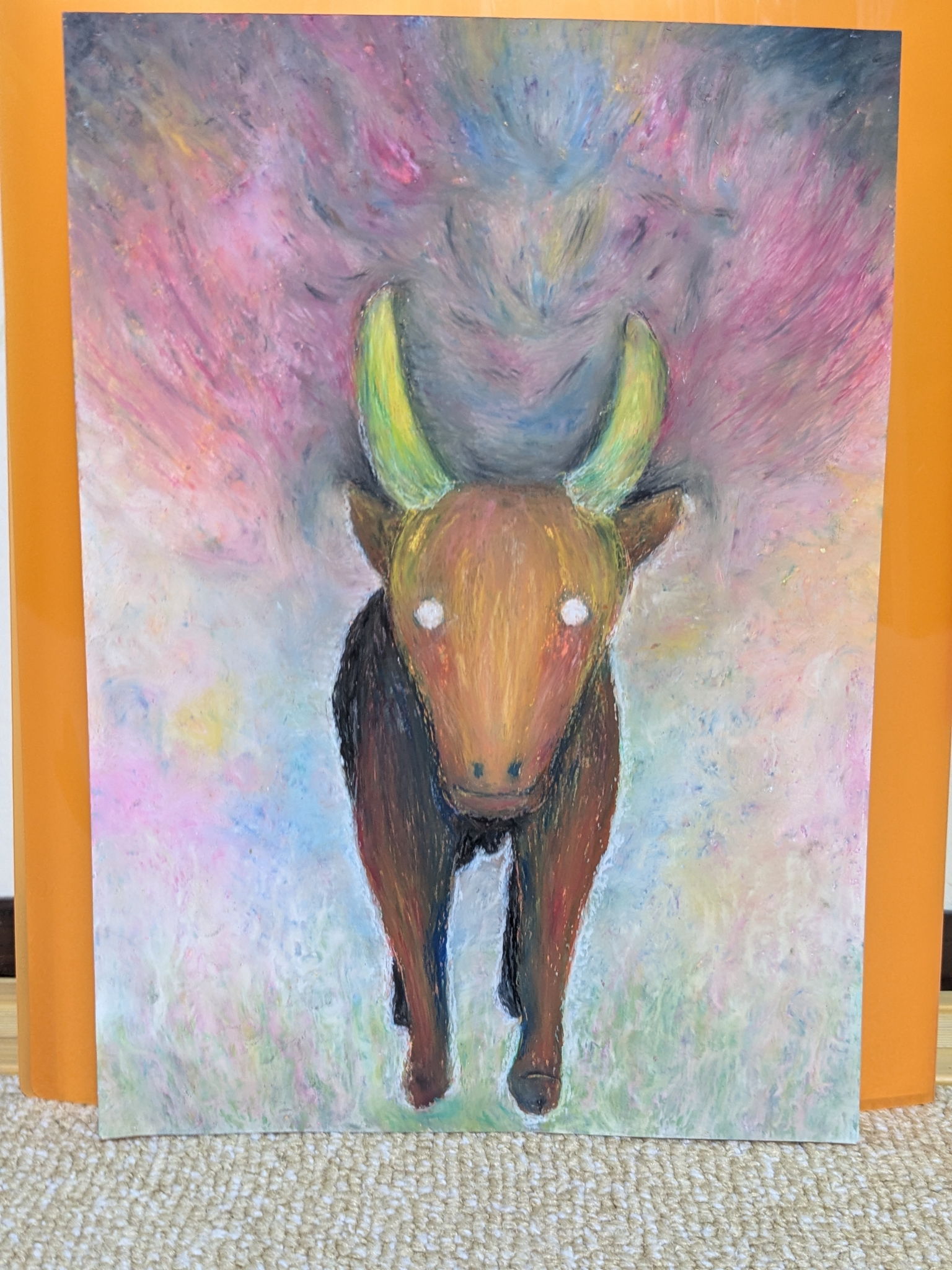 京都の醍醐寺を訪れた時に、仏像って手は複数あっても、足は2本だよなぁ、と思いながら見てると、たまたま足が6本の仏像に出会い、その仏様が座ってる水牛がかわいい♪とテンションが上がった時の私の頭の中でのイメージです。なので、本物とはちょっと違いますが、記憶の中の牛です。