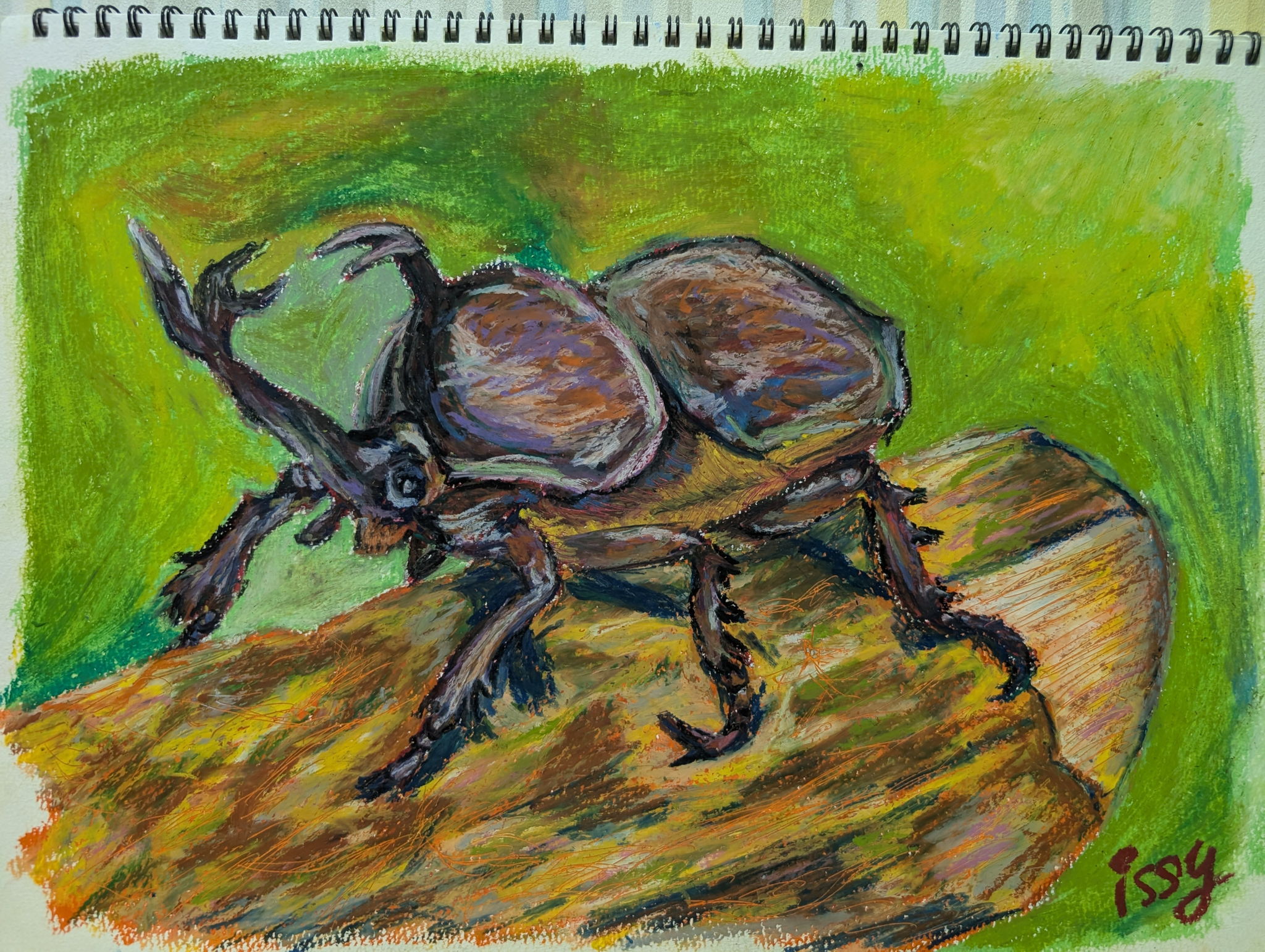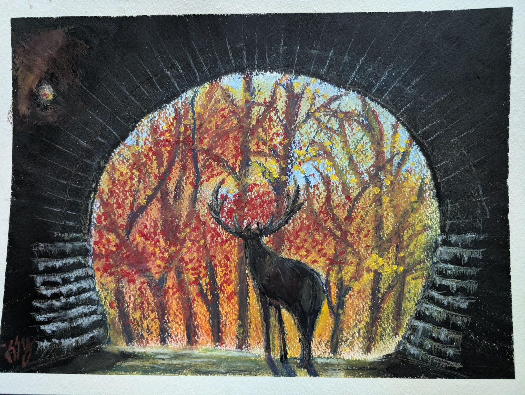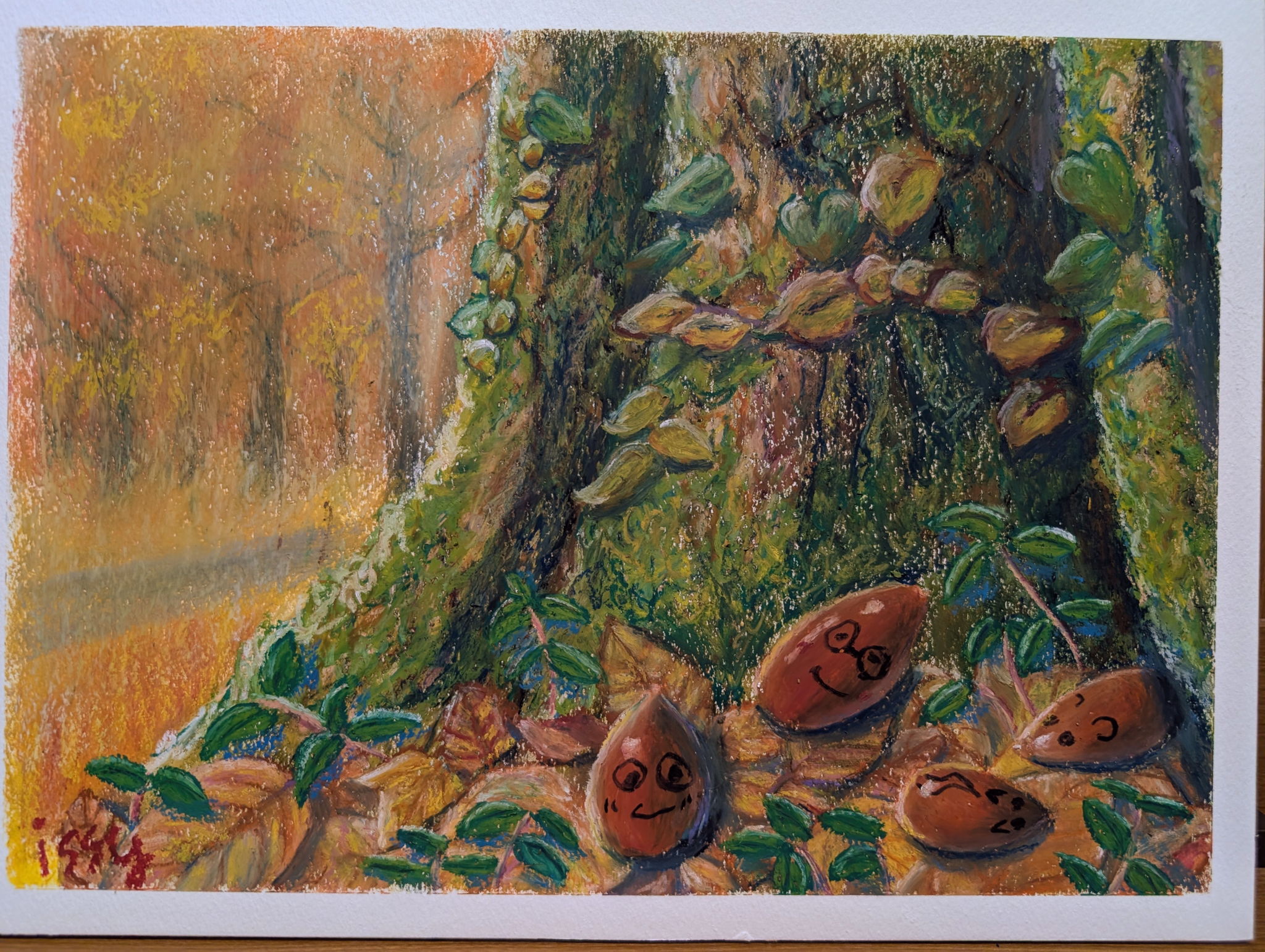 子どもからもらったどんぐりに、かわいらしい顔がついていました。そのどんぐりが森に帰って来た様子を描いてみました。