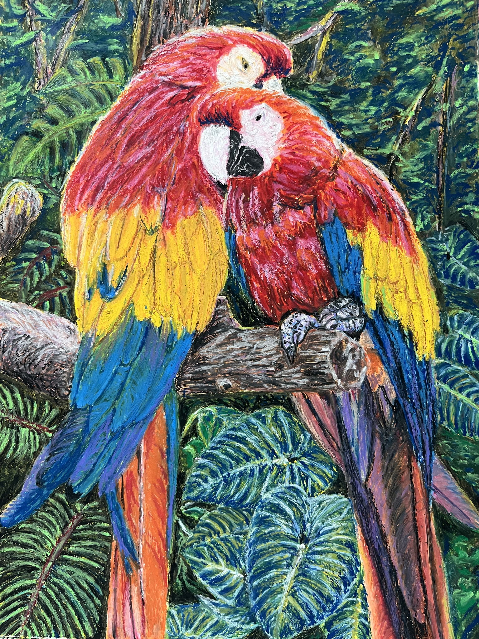 自然との共生をテーマにモチーフを選びました。アートクレヨンの効果が発揮できるようカラフルな生き物として、オウムを主体に、背景は想像で森を描くことで、奥行感を表現しました。昨今、社会では個人主義の動きが強くなってきたように思います。皆が、そしてあらゆる生物が、支えあって共存している。その事実を、改めて尊重しあえる世の中になれば良いなと思っています。