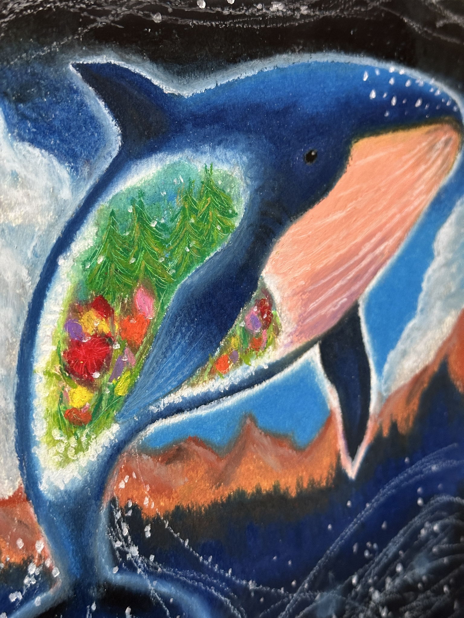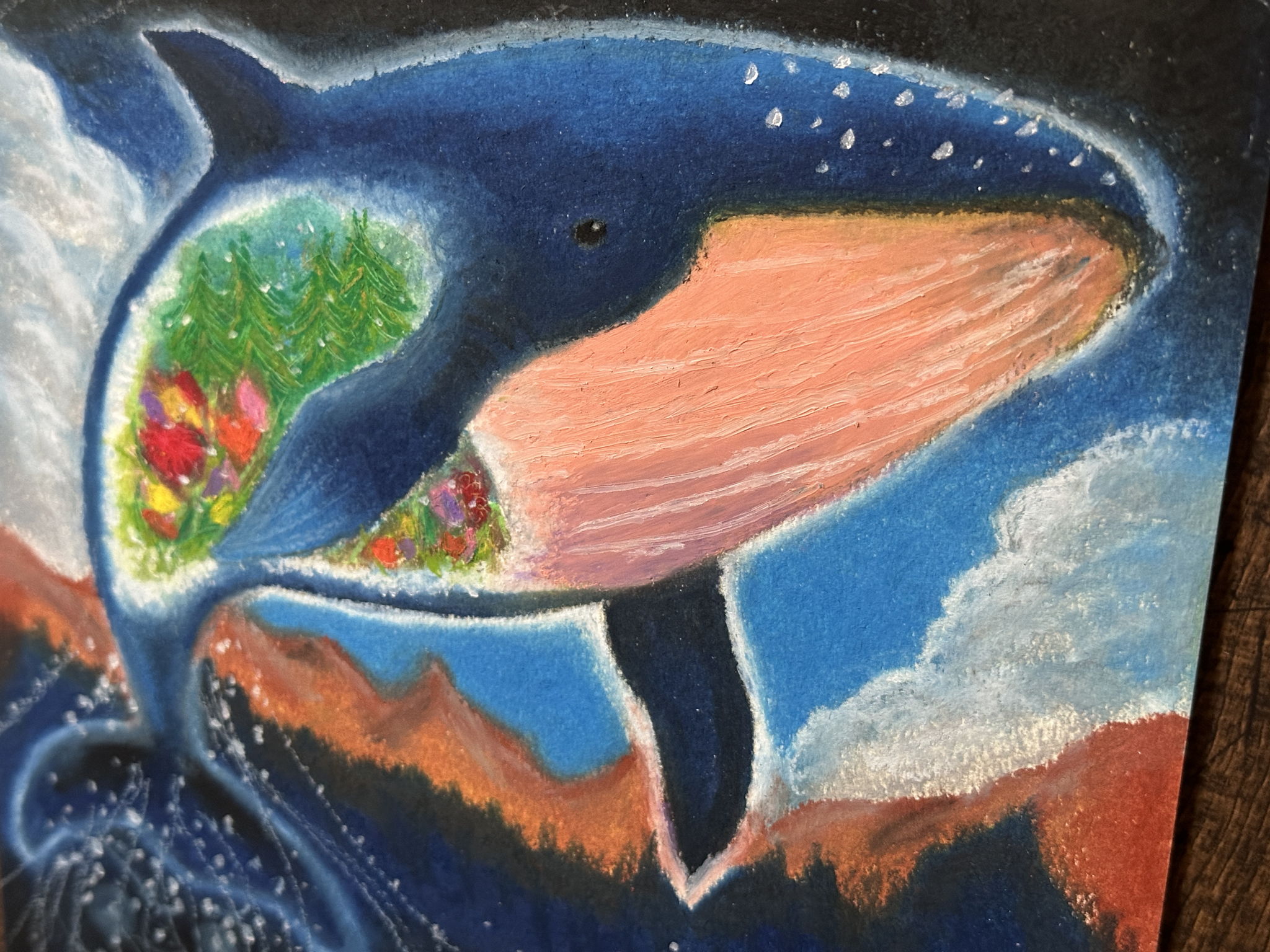 鯨が空を飛ぶ生き物だったら…と考えながら描きました。