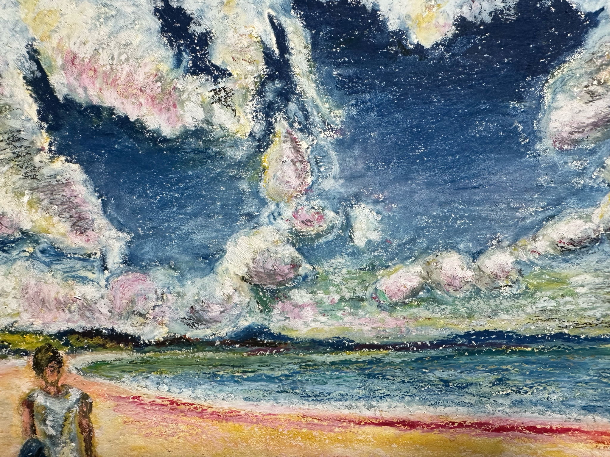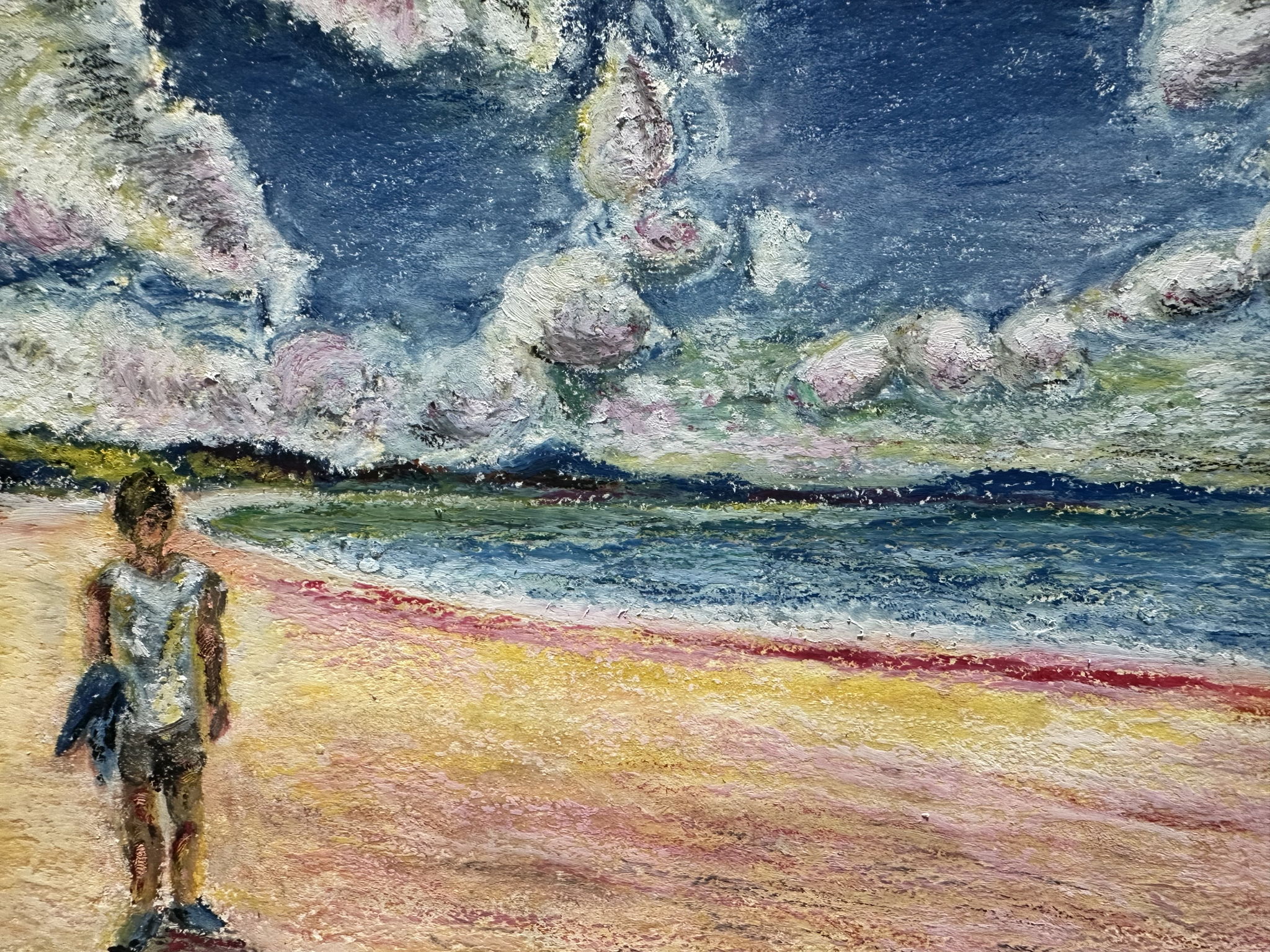 昨年、長男が沖縄で結婚式を挙げました。翌日の海と空と浜辺を散歩する次男を描きました。