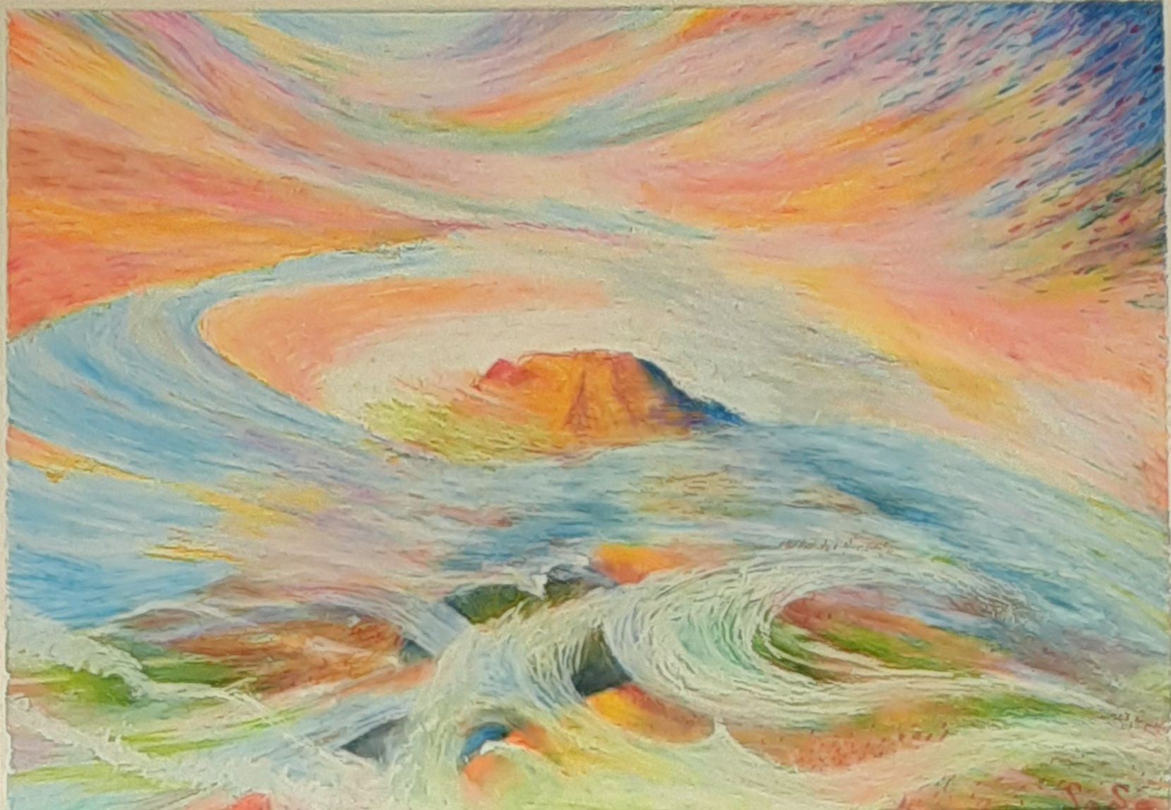 夕焼け空や雲を使って、山のまわりを吹き荒れる風を描きました。