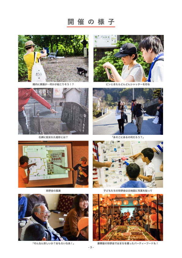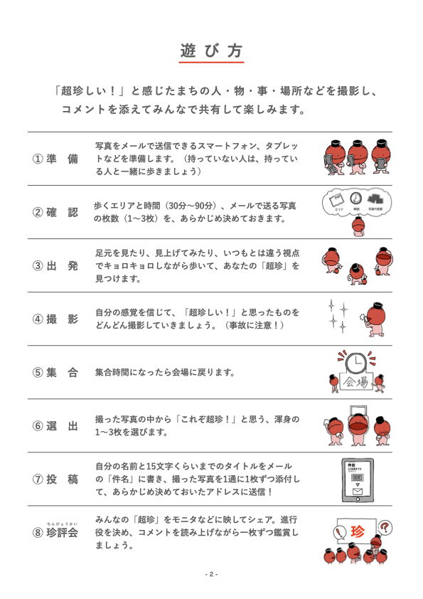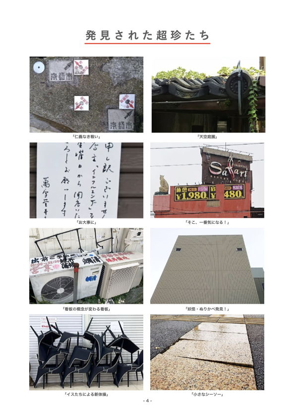 『超珍』は、“超珍しい!”をきっかけに、まちの見方を変えるアウトプット型まち歩きです。参加者は決められた時間内でまちを自由に歩き、“超珍しい!”と心を動かされた風景や出来事を撮影。その後、写真にタイトルをつけて見せあいながら「なぜそれを超珍しいと感じたのか?」について語りあう“珍評会”を行い、互いのまなざしを共有します。誰かの視点から切り取られた風景を通して、その感性に触れる体験は、自分自身のまちを見る眼を育てるきっかけにもなります。見方の違いを楽しむことで、多様な価値観に気づきながら、まちへの愛着が深まっていきます。