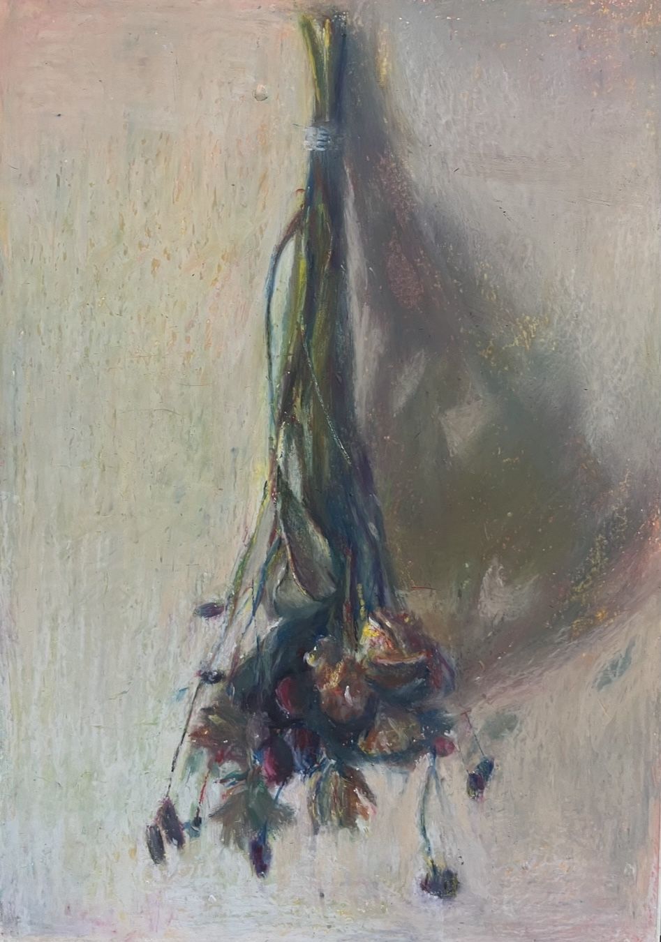 壁に吊るされている花束を描きました。じきにドライフラワーになることを想像しながら見ていただきたいです。