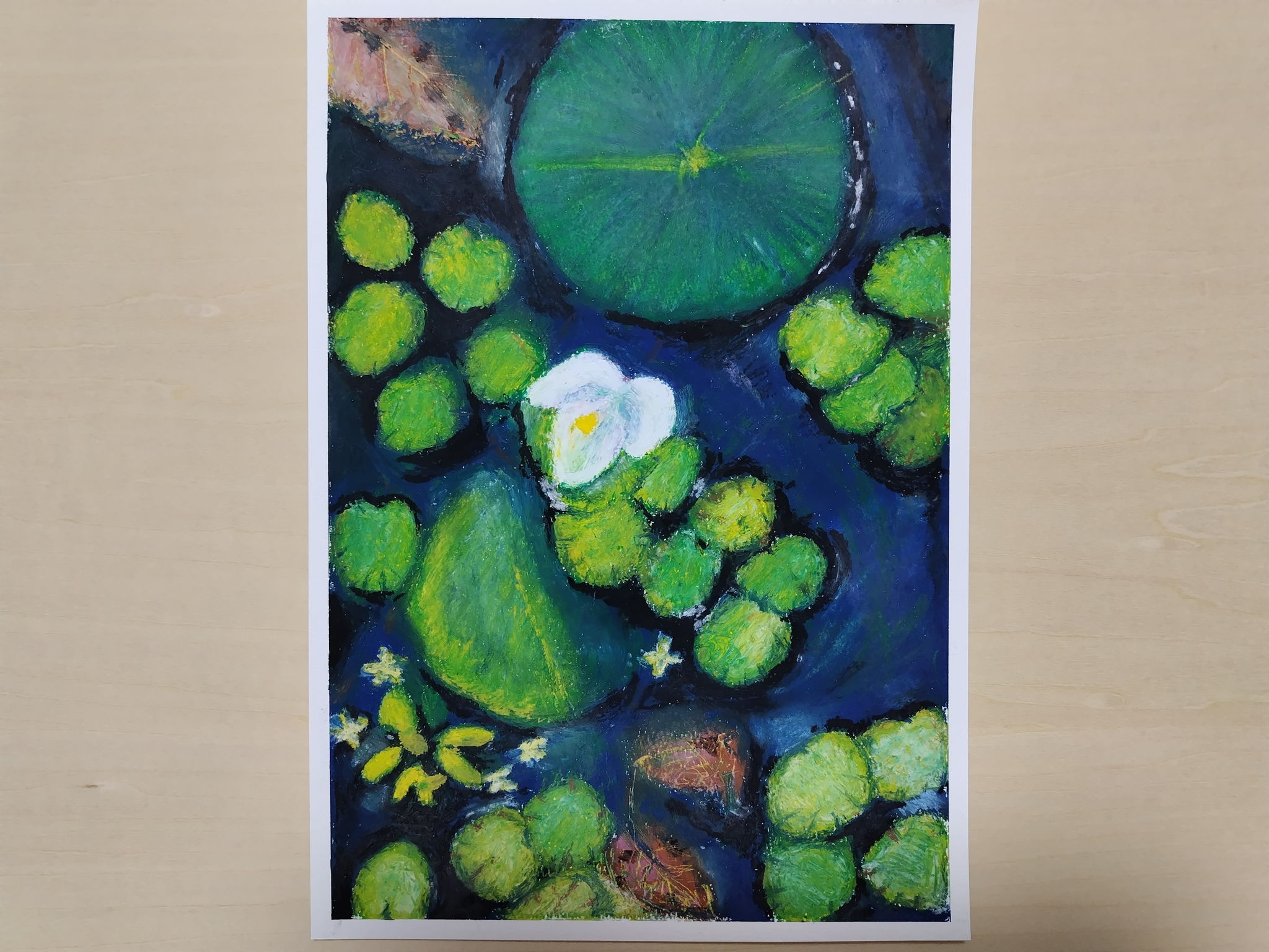 近所のお寺の庭にある小さな水鉢の中を描きました。数年前に水の深い青色が印象的だったので写真に撮りました。水鉢を覗き込んだ時、小さくて狭い世界なのに底の知れない深さ引き込まれるような印象を受けました。絵に描けたら素敵だろうと思っていましたが、どうしたらいいかわからないのでそのままにしていました。今回『アートクレヨン展』を知り、そういえばアートクレヨンの青色はあの水の色の印象に近かったと思い、描いてみることにしました。水の透明感というか滑っとした感じをあらわすのは難しく、植物も物足りなく感じますが、描いていて楽しかったです。