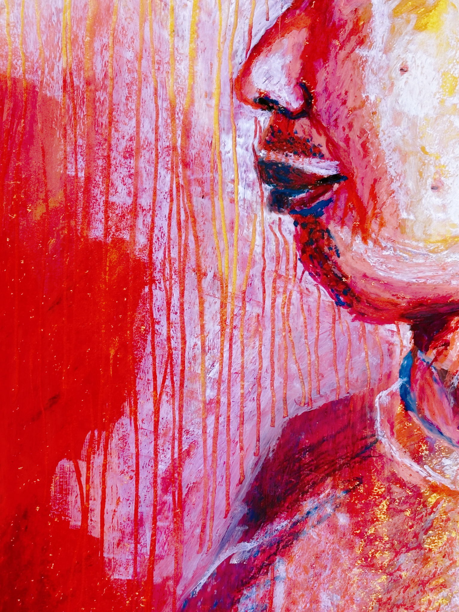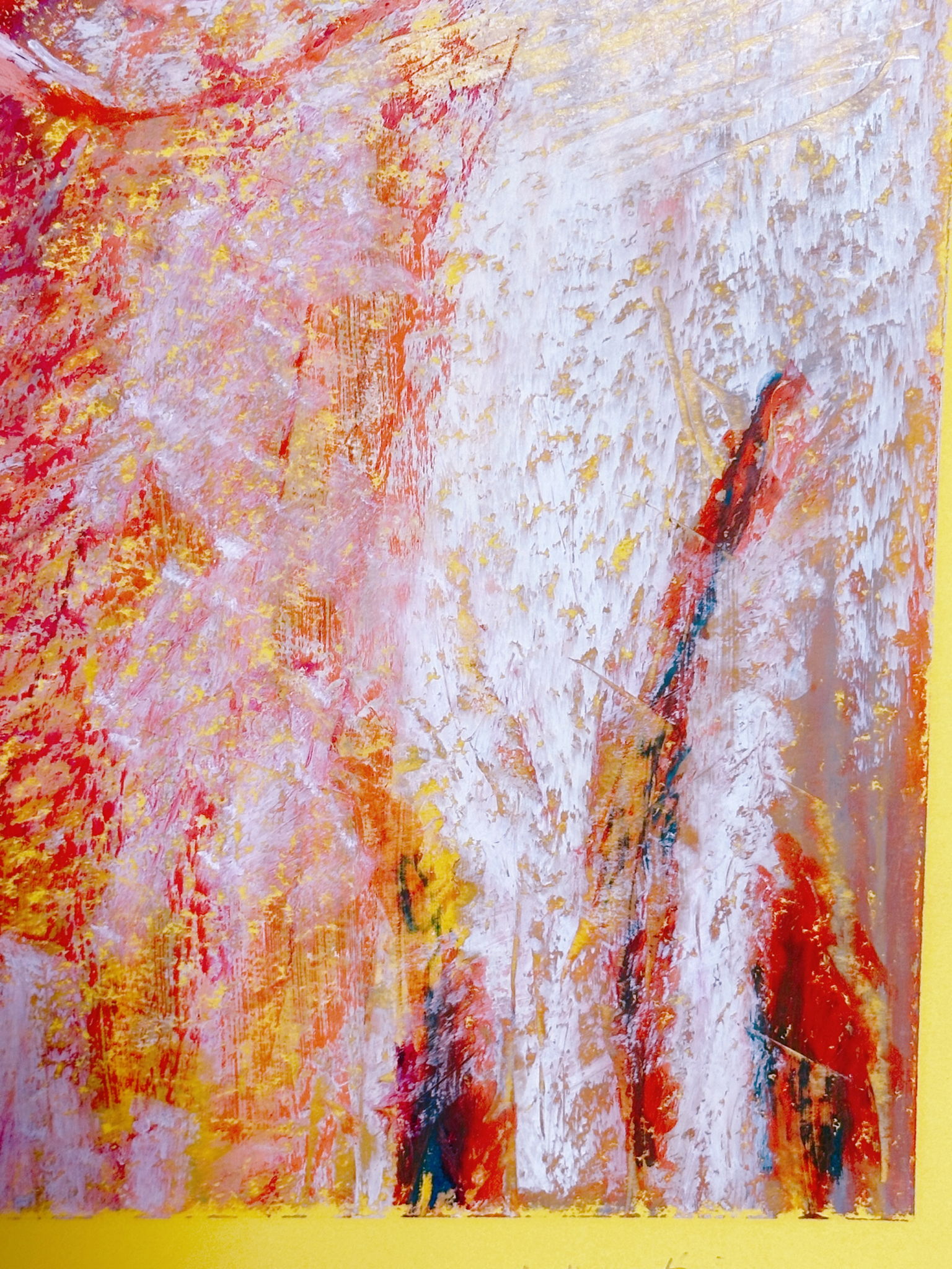 木製の壁の前なのですが、木目はペインティングナイフでパステルを削って表現しました。