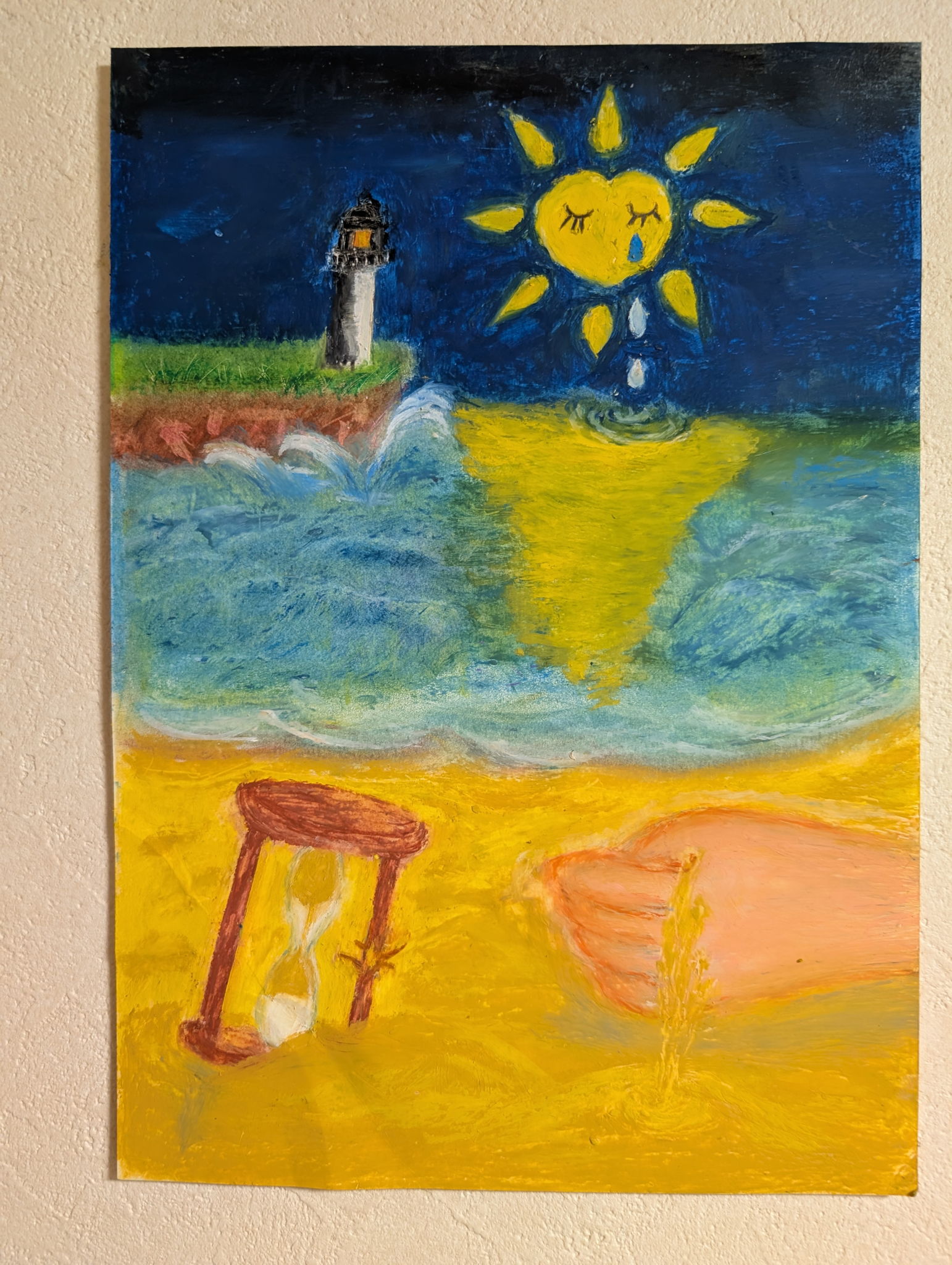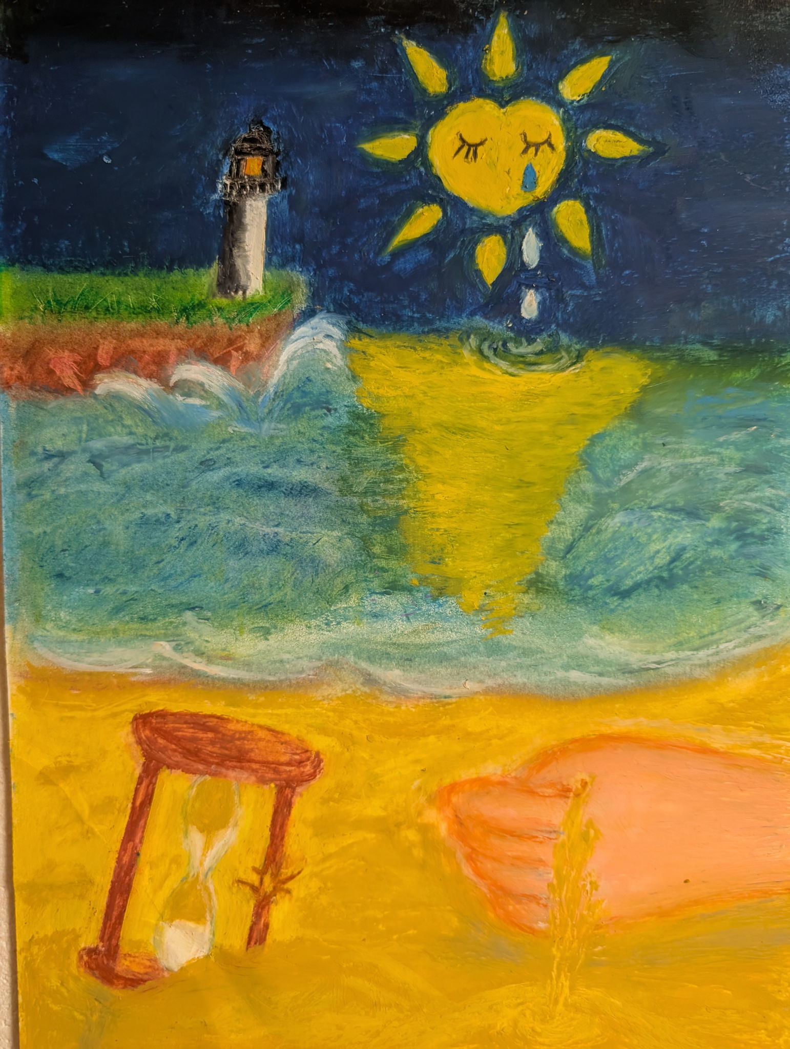当時の私の気持でしたが、今、世界では戦争、紛争が起きています。家族やお家を失い難民生活をしている人々がいます。幸せが手からこぼれ落ち、砂時計は時間の巻き戻しを。心の太陽は涙している場面です。