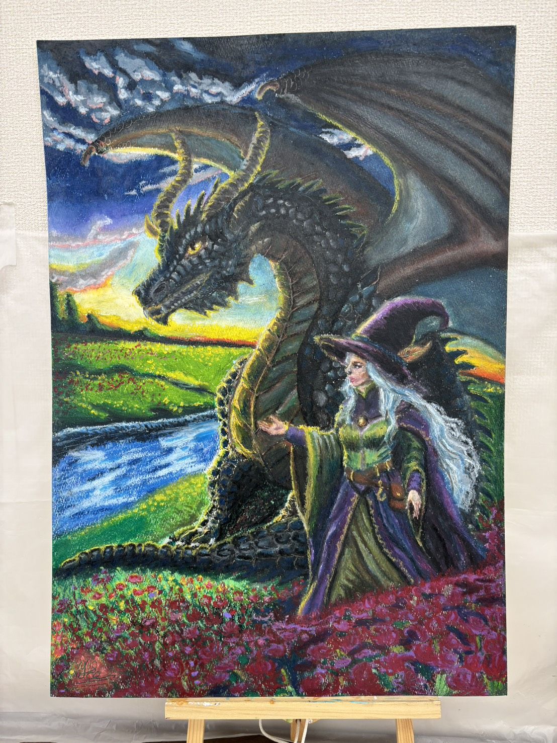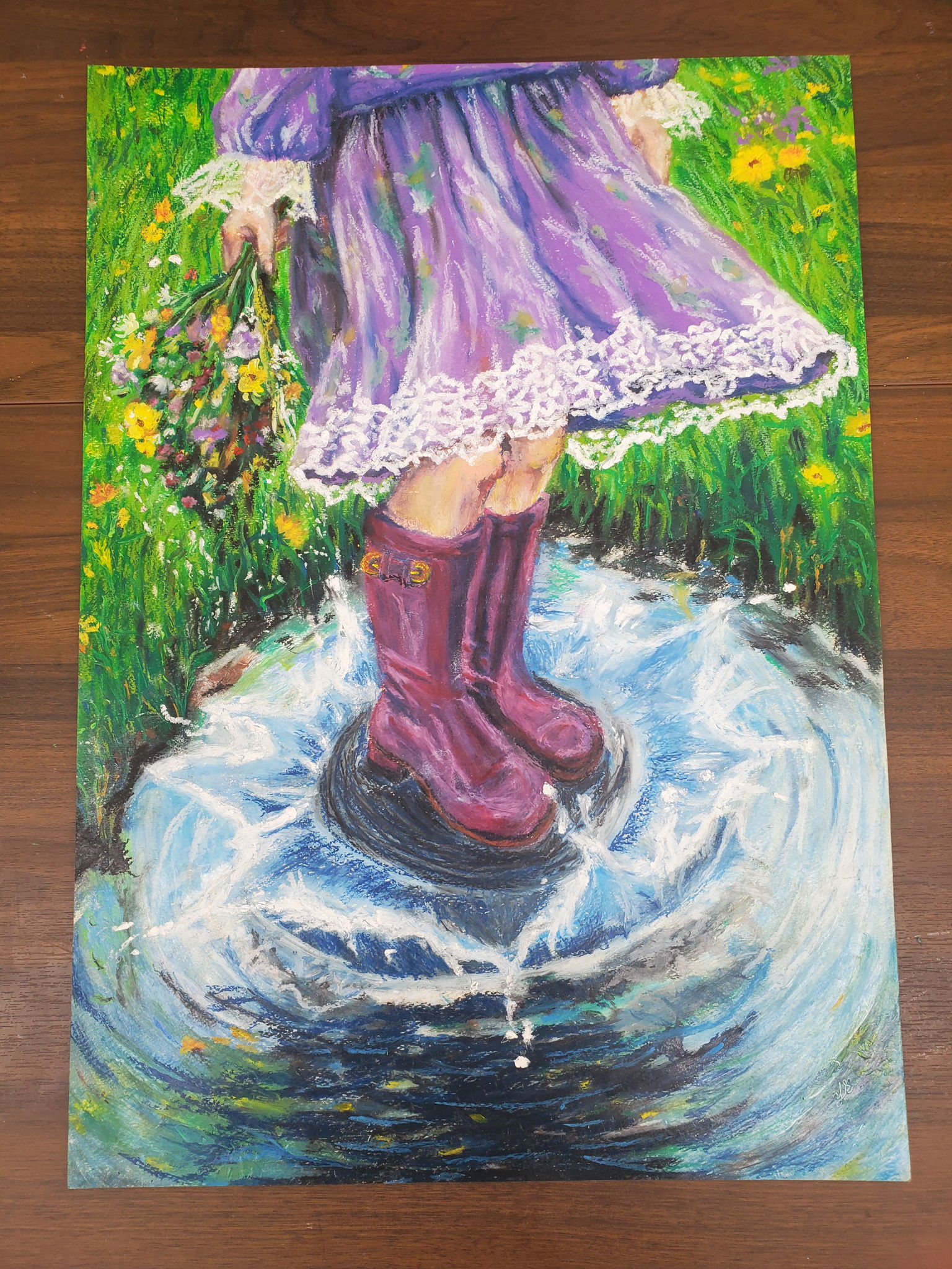 雨上が上がって外で遊び始めた、女の子が弾む気持ちや雨が上がってお外で遊べる嬉しい気持ちのまま、雨上がりの水溜まりに跳び込んで水飛沫を上げてる場面を描きました。