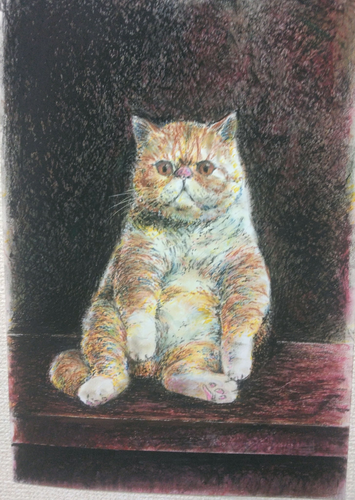 初めてアートクレヨンを使い描くので、どうせなら家に飾っても飽きのこない絵を描こうと思い愛嬌のあるエキゾチックショートヘアをモデルにしました。
