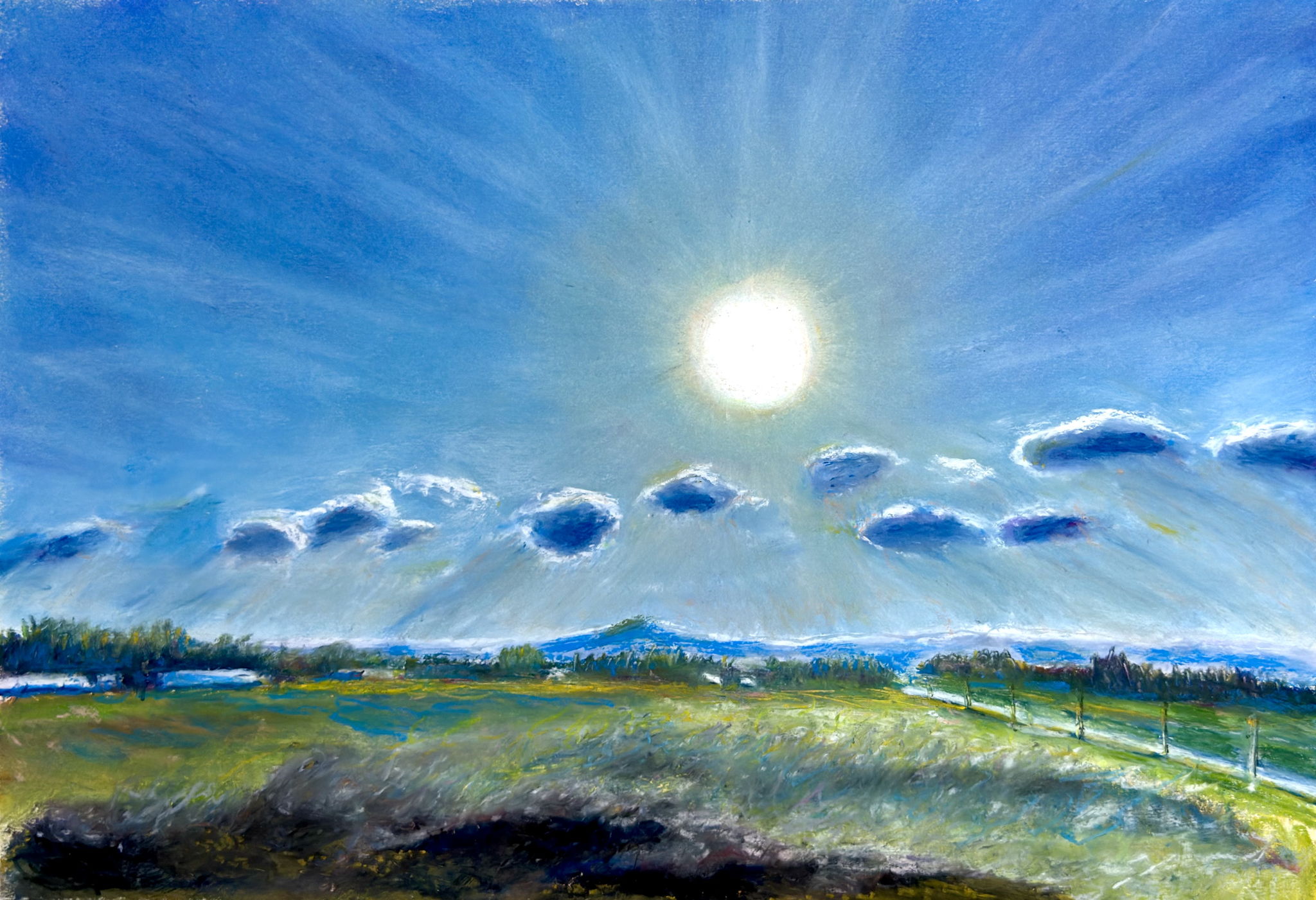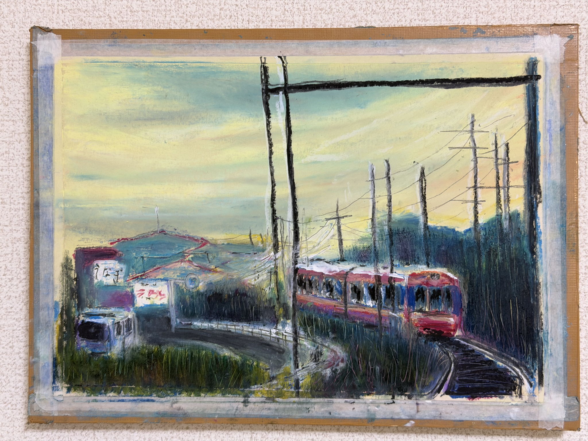 夕焼け時の宍道湖湖畔を走るローカル線を描きました。