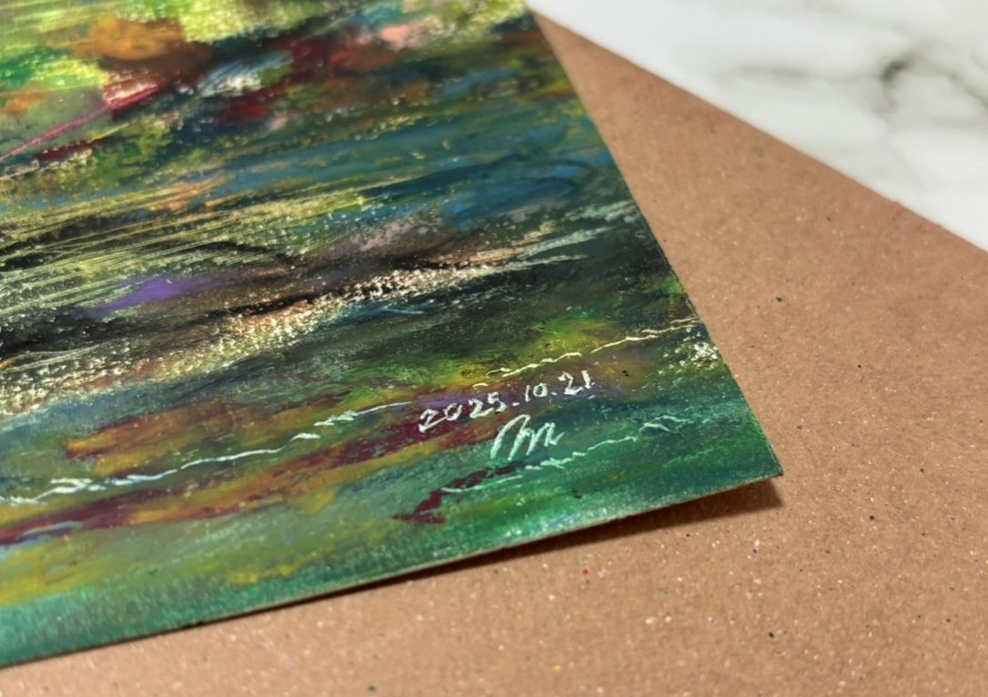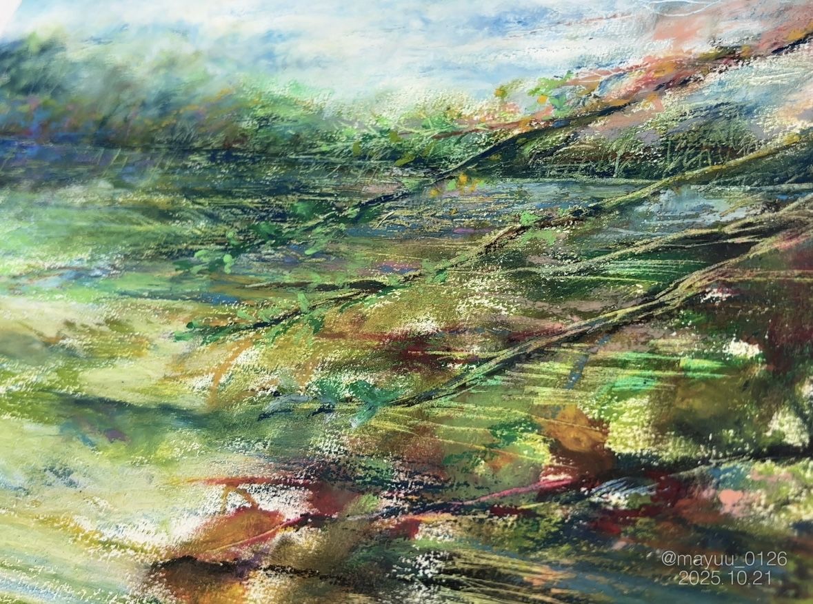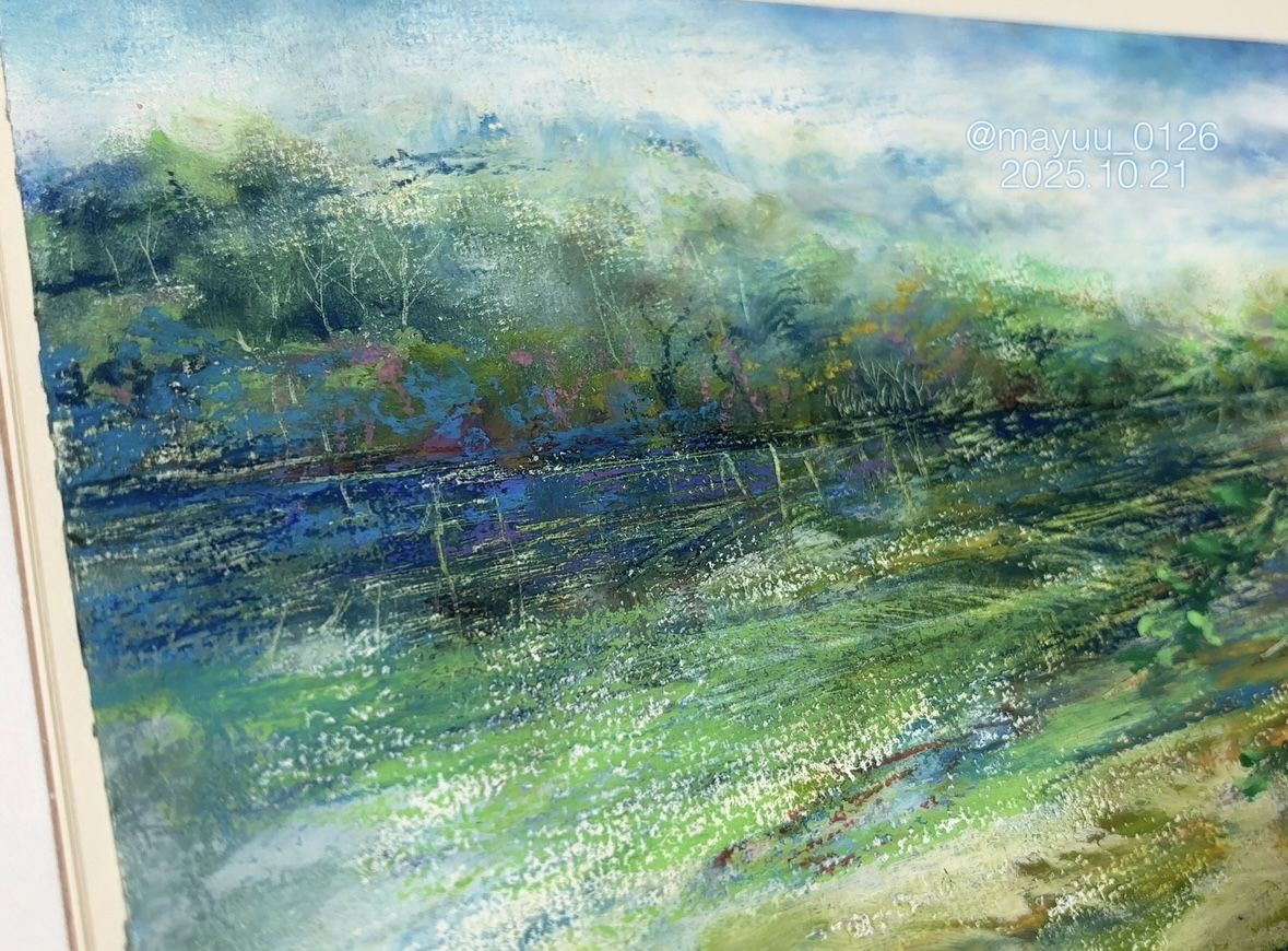 「ありふれた日常、どこにでもある風景」がテーマです。人によって異なる、心の中の原風景に重なるように、葉や水辺に赤や茶を加えることで、様々な時間帯、季節に見えるように意識して描きました。