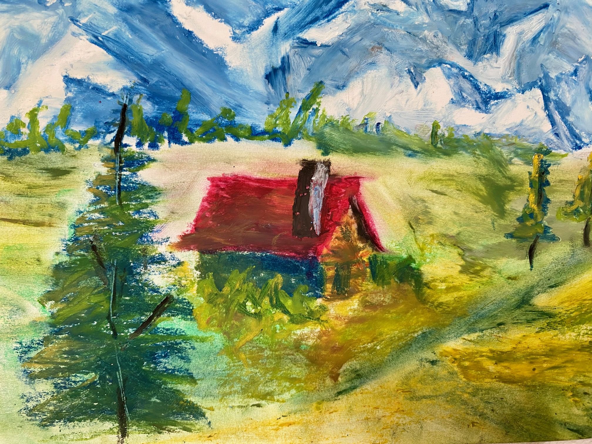 ボブ・ロスがよく描いている山や木、小屋をイメージして描きました。刷毛が欲しかったな〜
