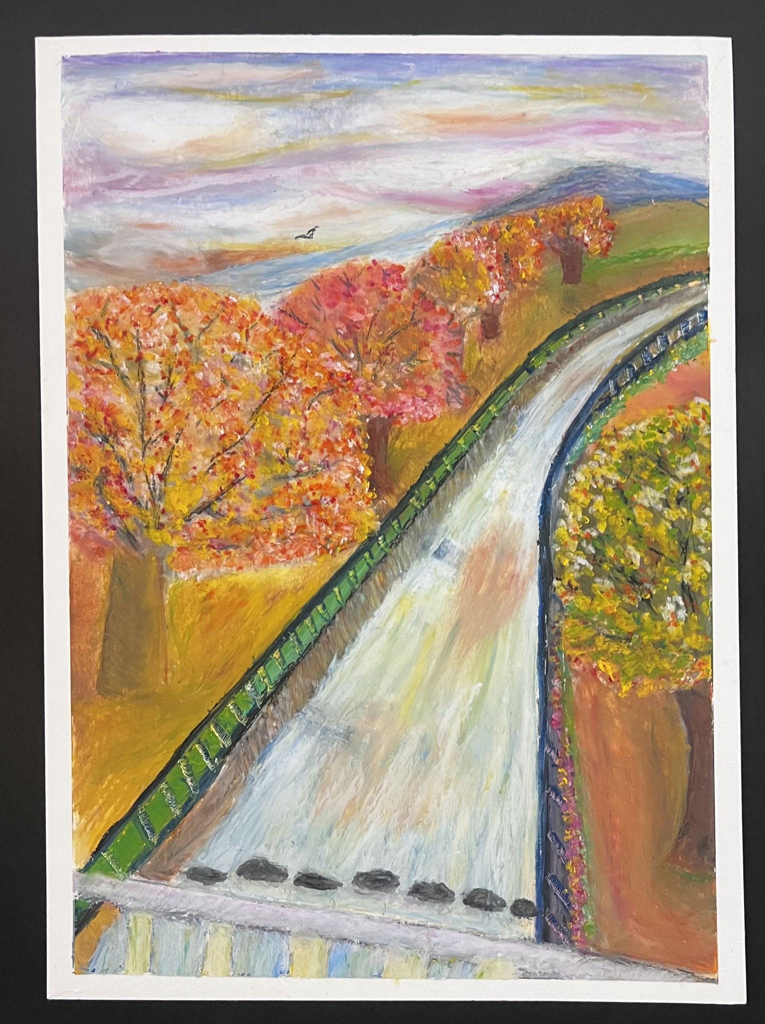 夕焼けの空が、1日の終わりを感じさせてくれるホッとする時間を描きました。