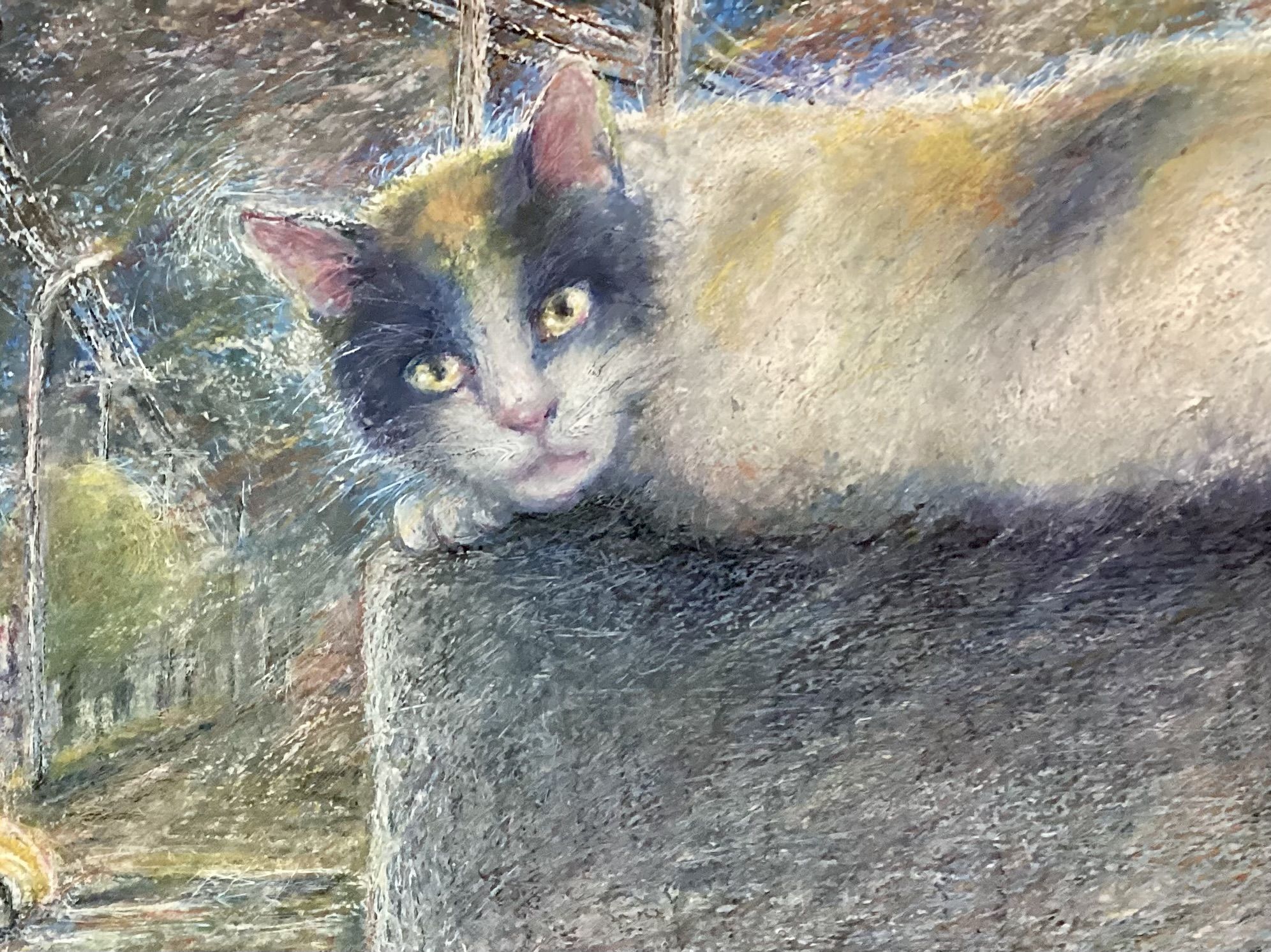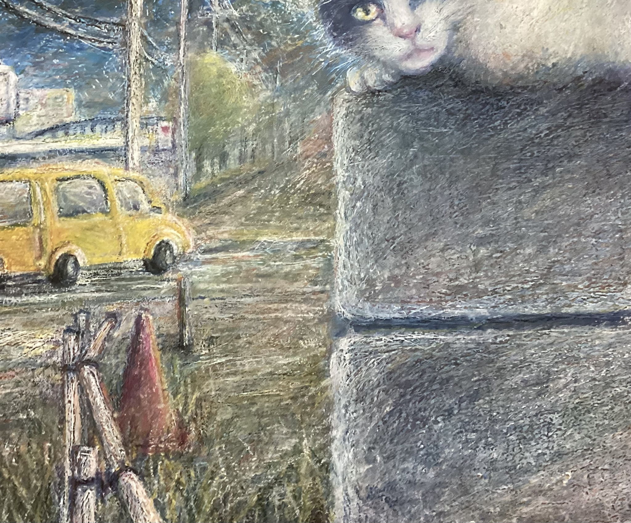細かい部分は針金で引っ掻き、光や猫の毛並みを表しました。一方で、猫がいる塀のゴツゴツ感もクレヨンを大胆に動かし質感の変化を楽しめました。