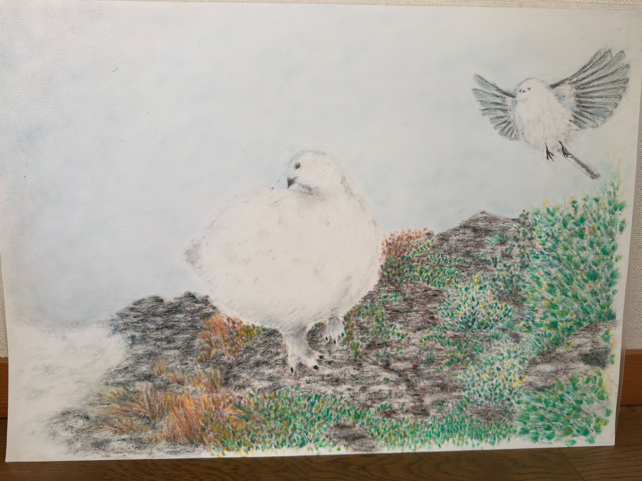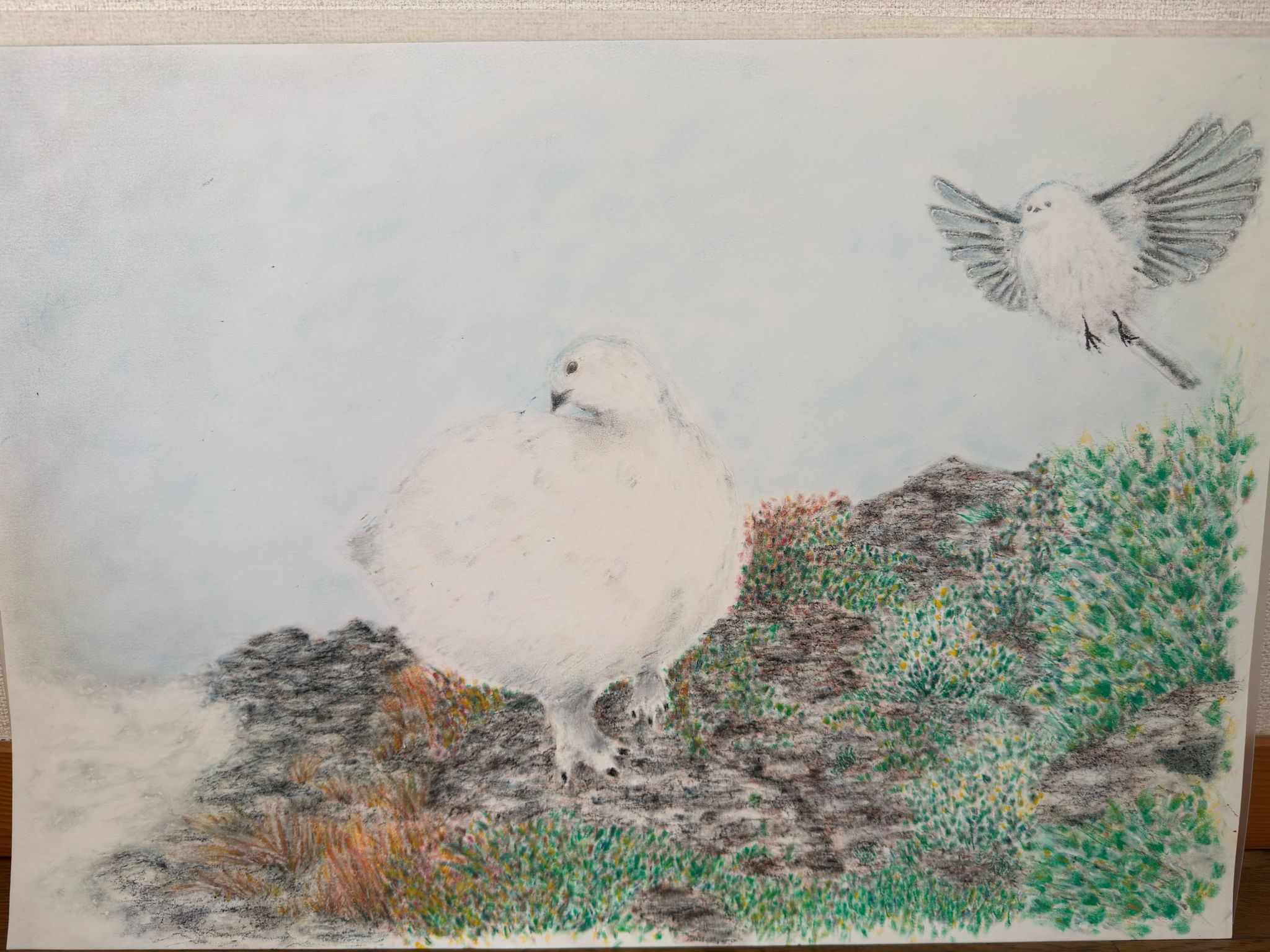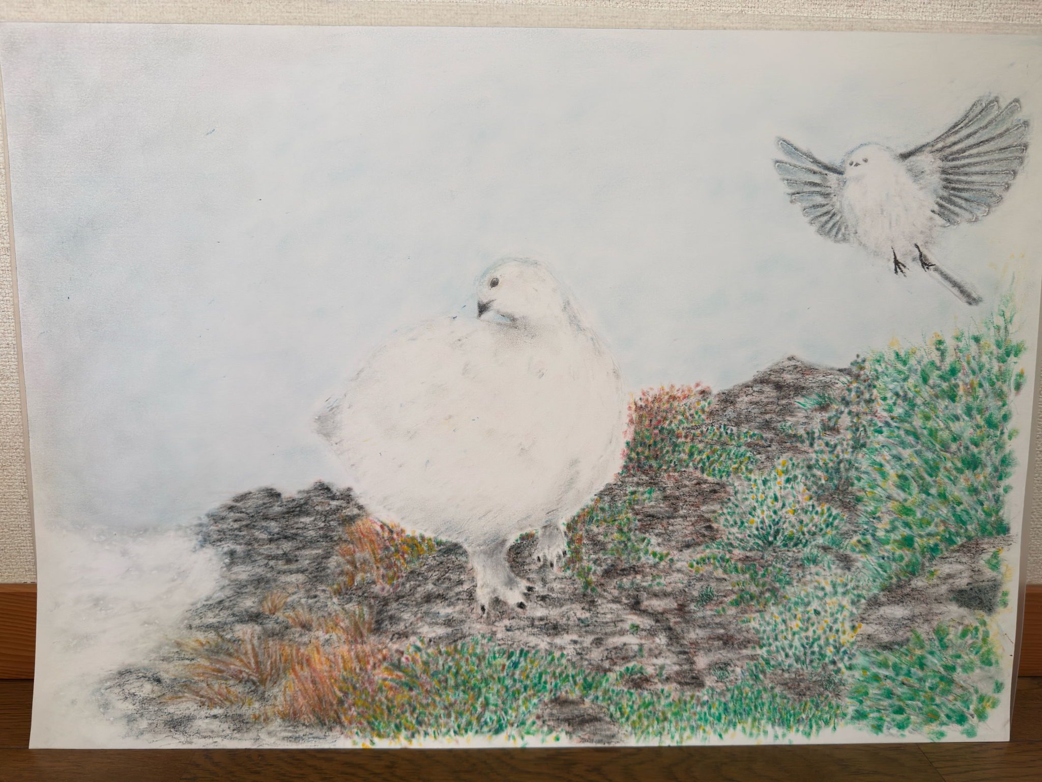 北海道産極小大福"シマエナガ"と、長野県産最古の大福"ライチョウ"を描きました。あと少しでかわいい大福たちが雪原に現れると思うと、ウキウキします。