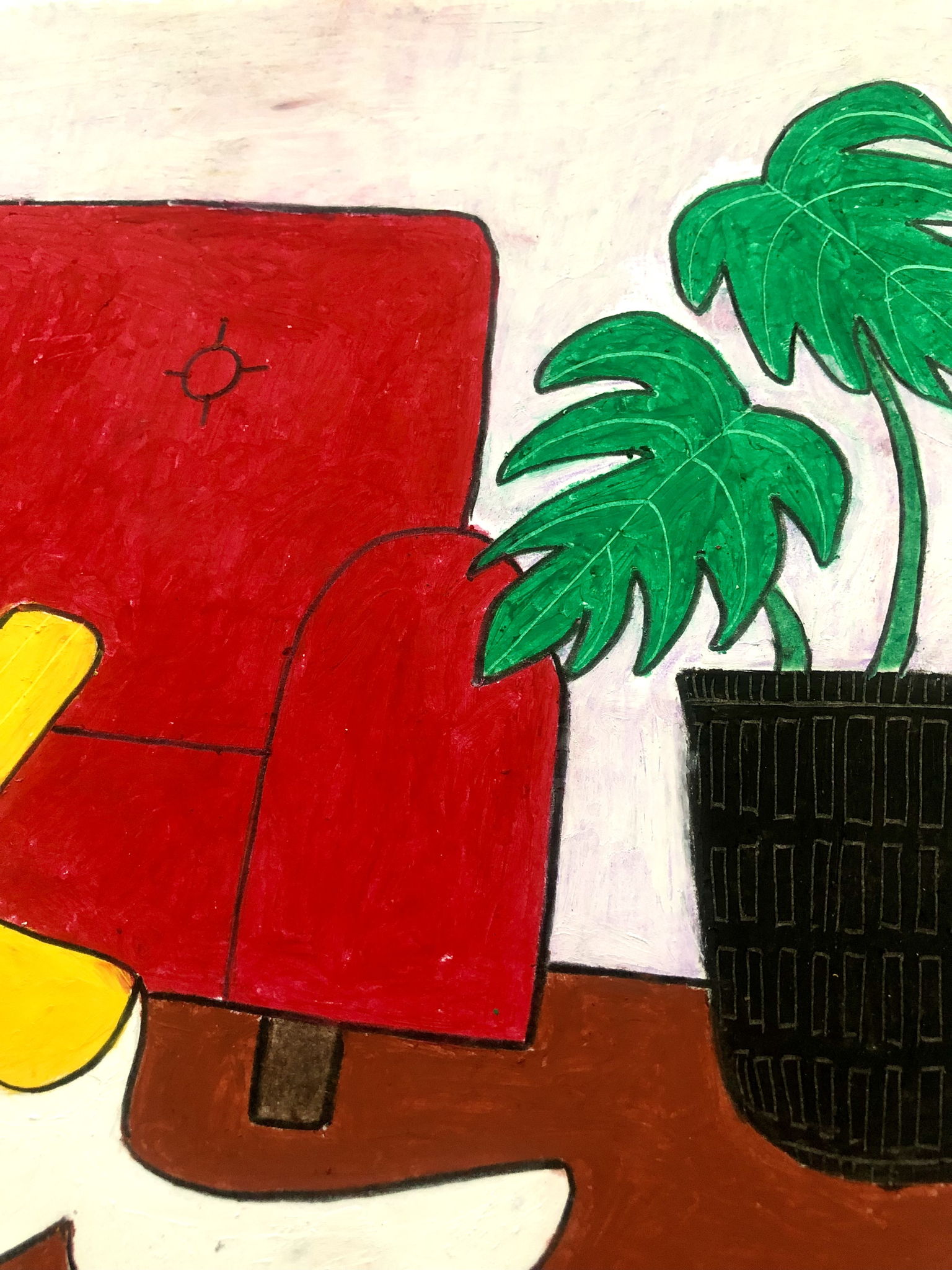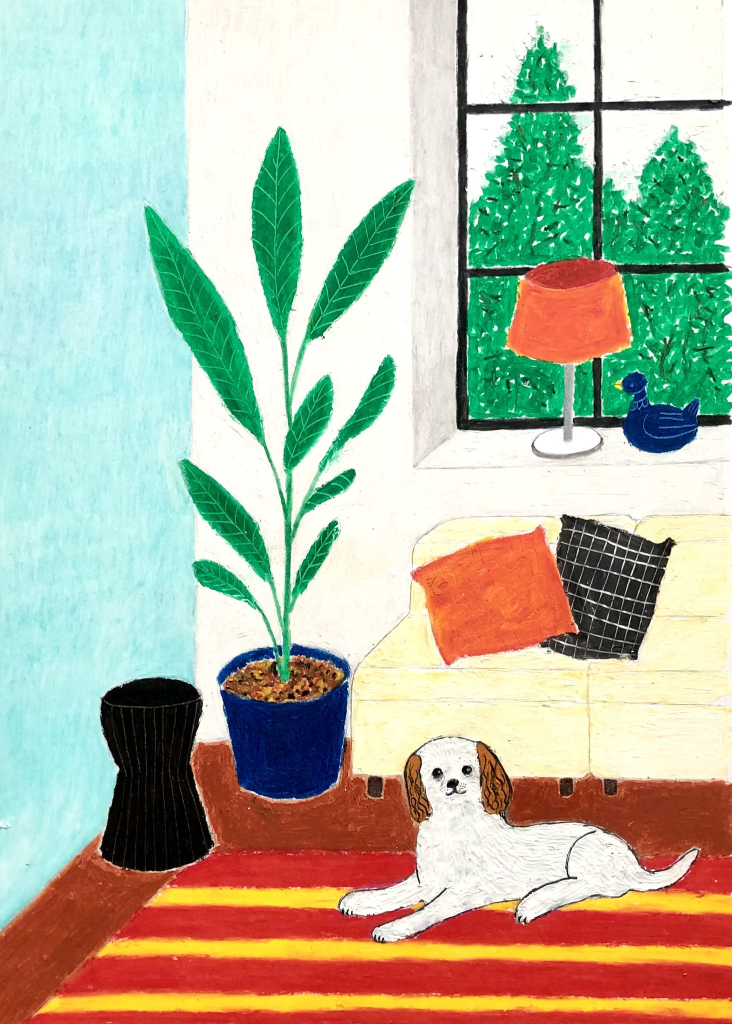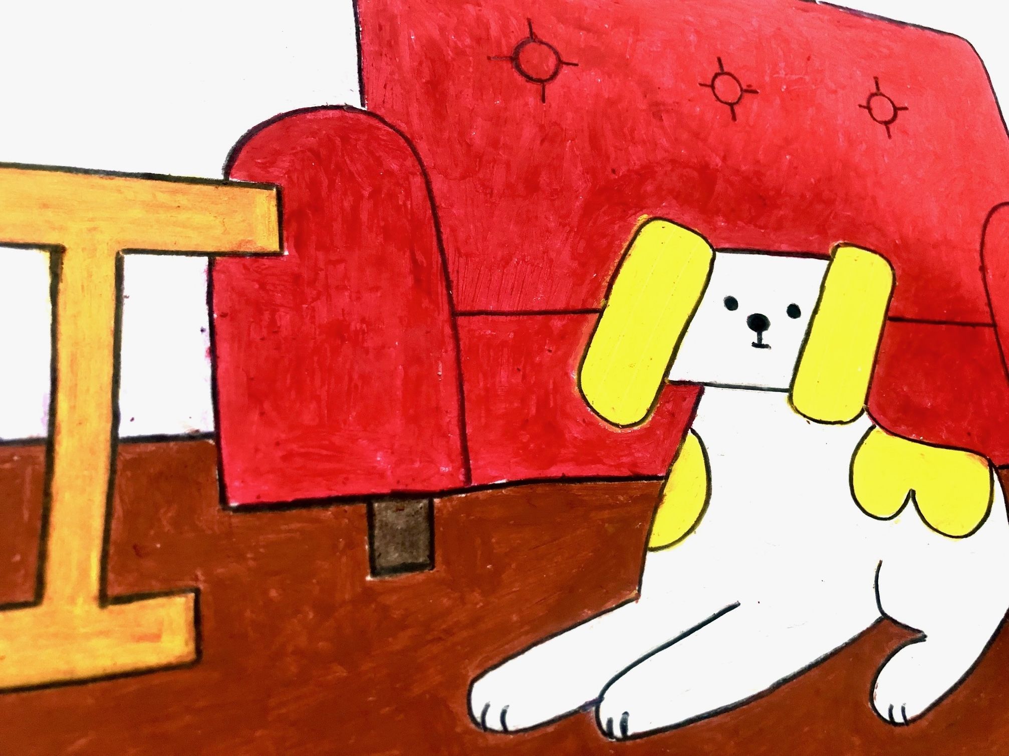 愛犬と過ごした穏やかな時間を思い出しながら描きました。いつもソファの前で、静かに私のそばにいてくれた子です。初めての土地で、慣れない暮らしを共に過ごしたあの部屋で、少しずつ心が満たされていった瞬間。その思い出を、ペンてるのアートクレヨンのやさしい色で表現しました。「ここがボクの場所」という題名には、安心できる居場所と、今も胸に残るやさしい記憶を込めています。