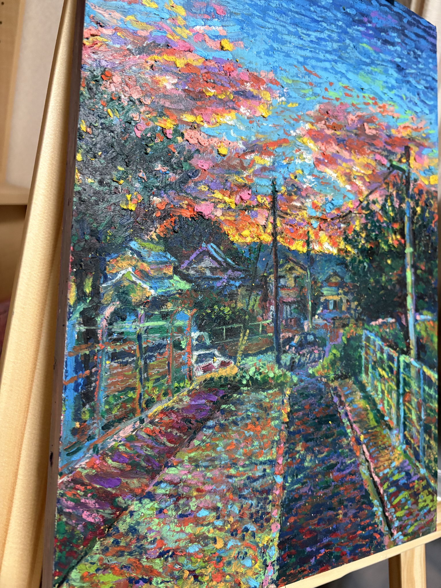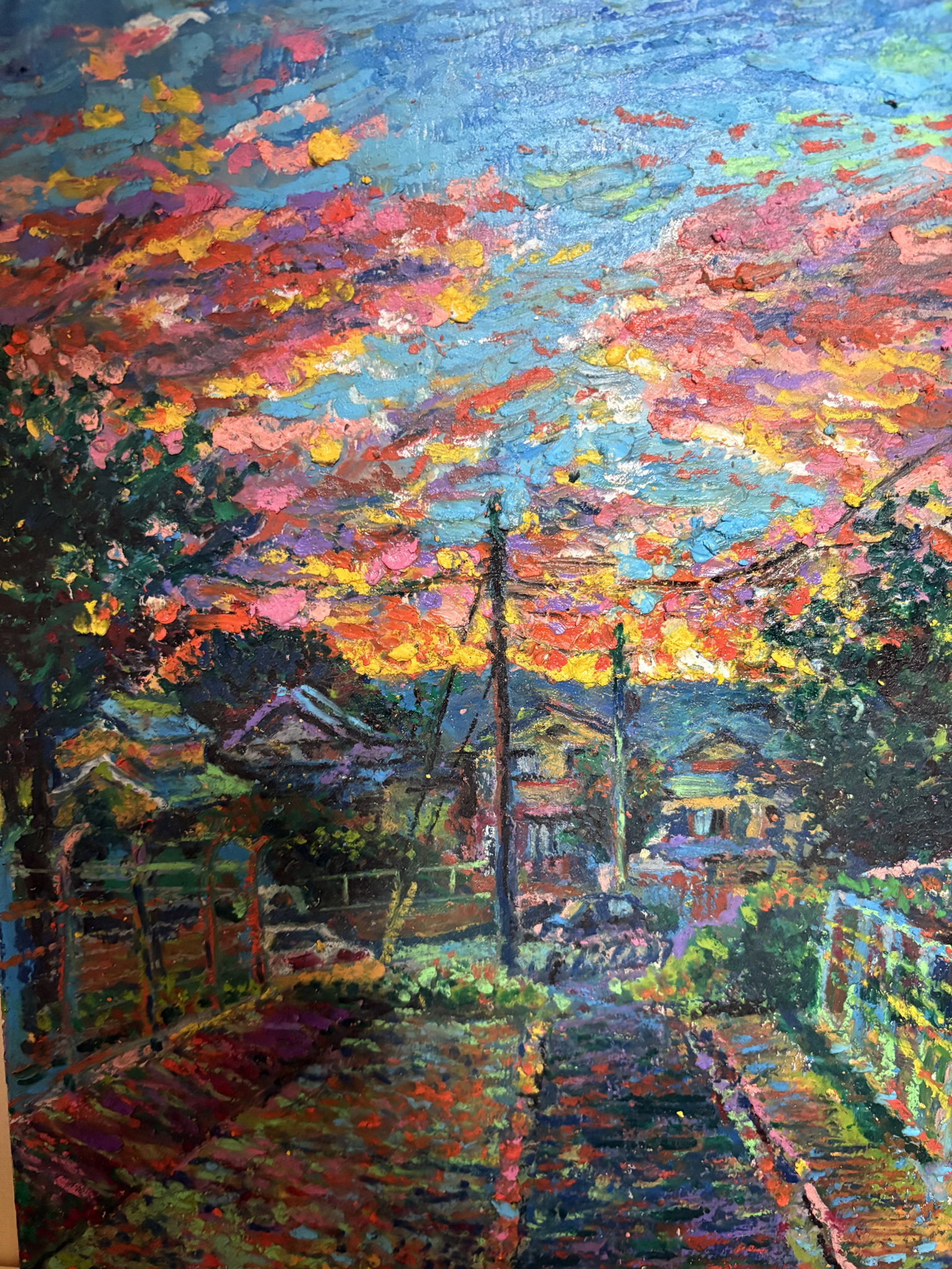 いつもの帰り道風景を描きました。空の夕日は雲と山に隠れ、自分の歩く道が逆光になり、明るくなった空との対比を描いています。太陽は隠れていますが、鮮やかに明るくなった雲がその存在を示しています。「あの山の向こう側に行ってみたい!」という思いで描きました。私は頻繁にクレヨン画を描くのですが、アートクレヨンを使用したのは今回が初めてで、原色をそのまま残すように力任せに描くいつもの自分のやり方をしてみました。