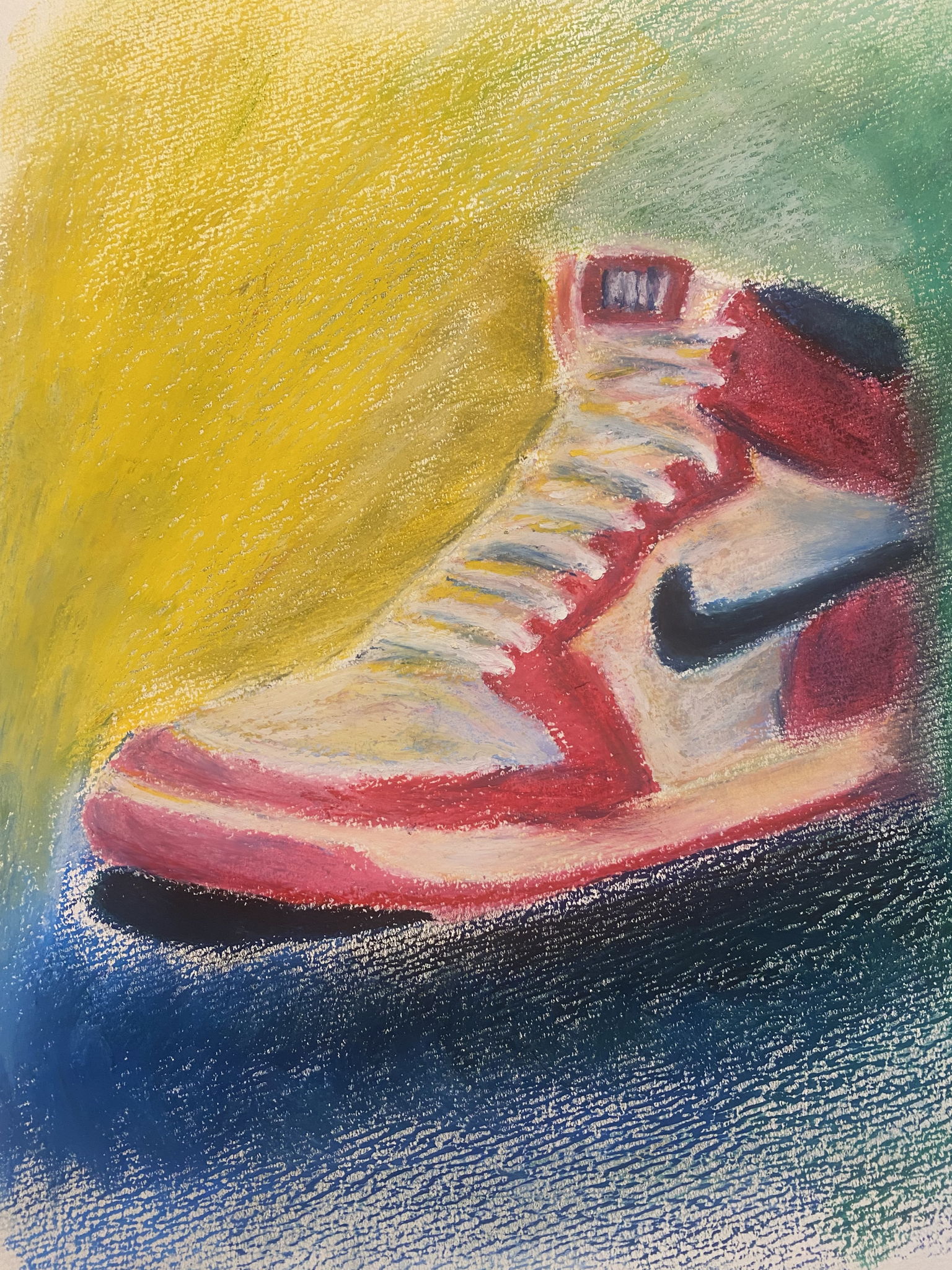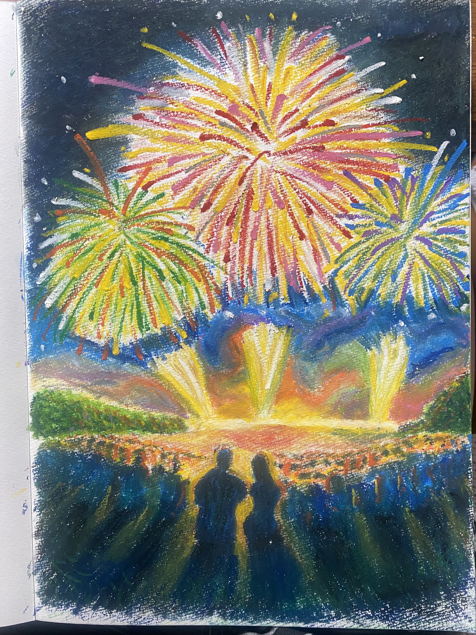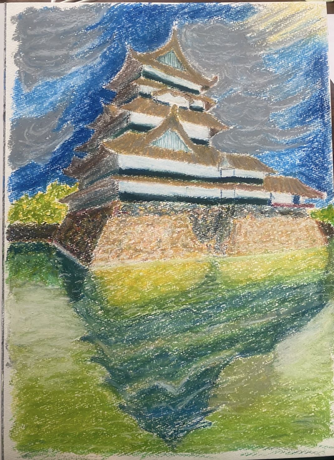 暗い色を作るのと電灯の明かりの反射を描いてみようとこの様な絵にしました。